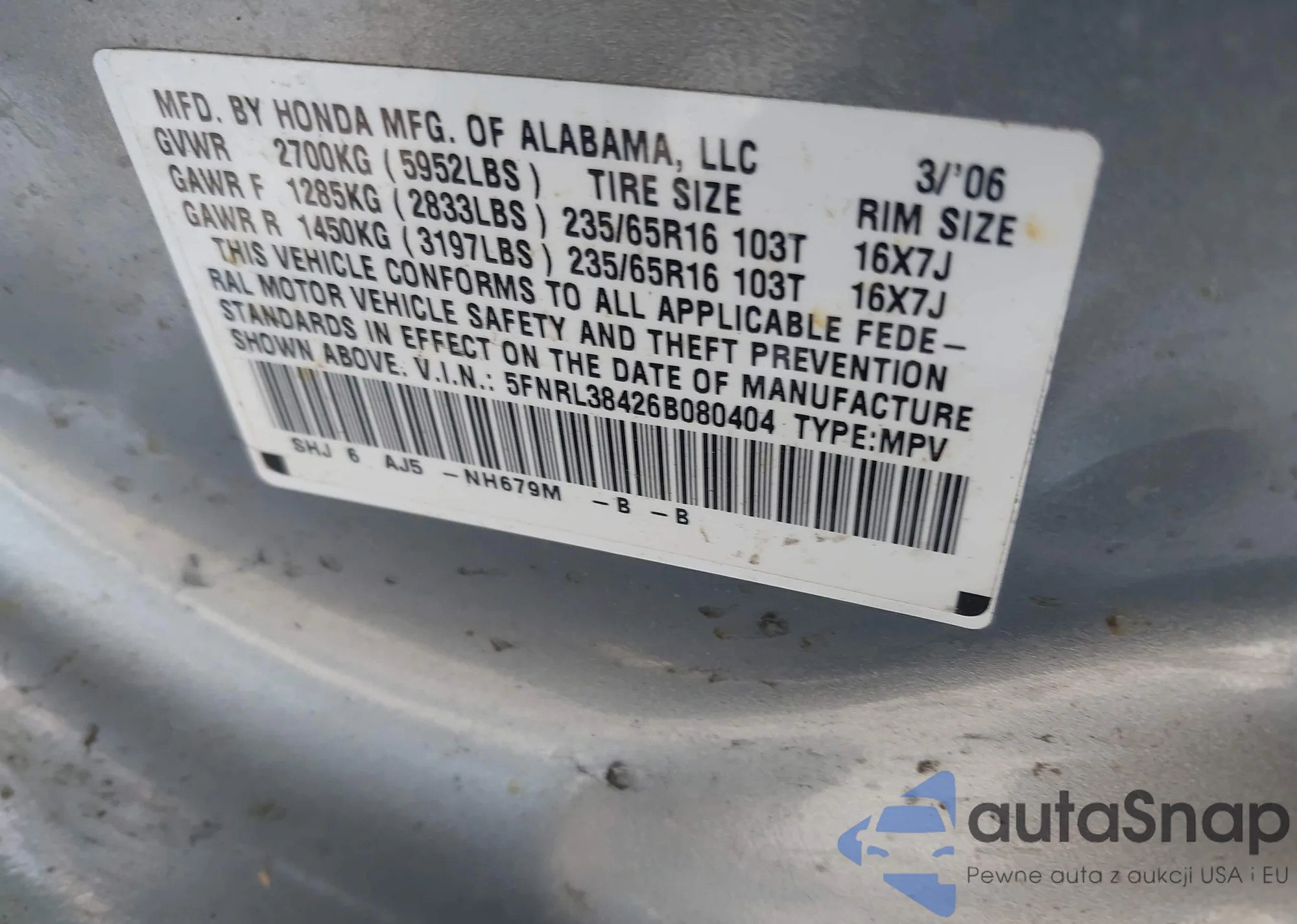 • VIN: 5FNRL38426B080404