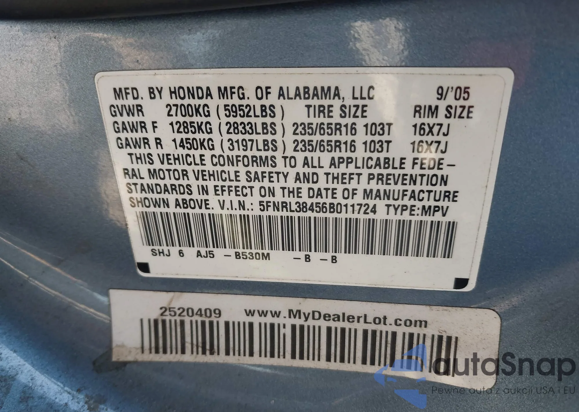 • VIN: 5FNRL38456B011724