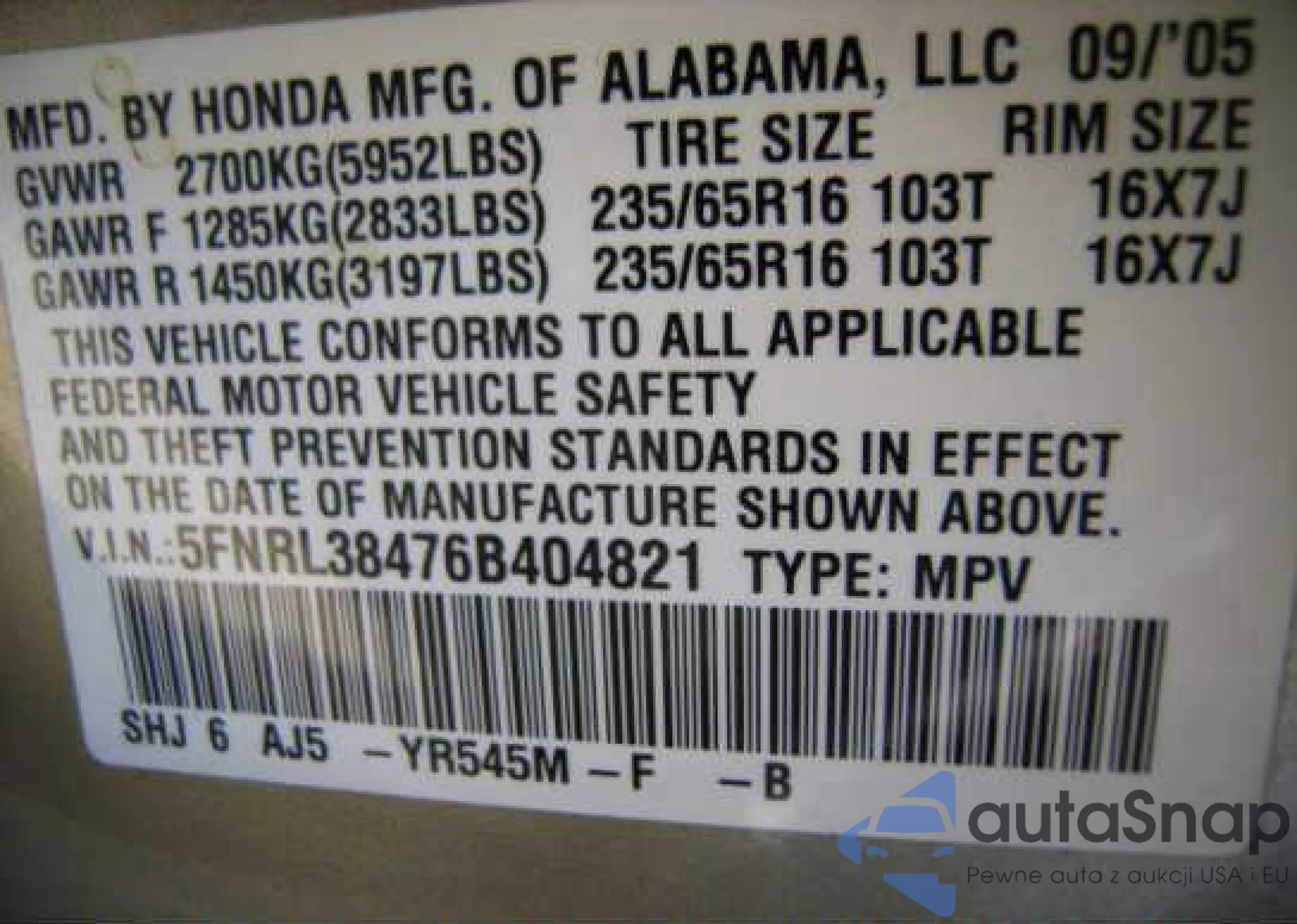 • VIN: 5FNRL38476B404821