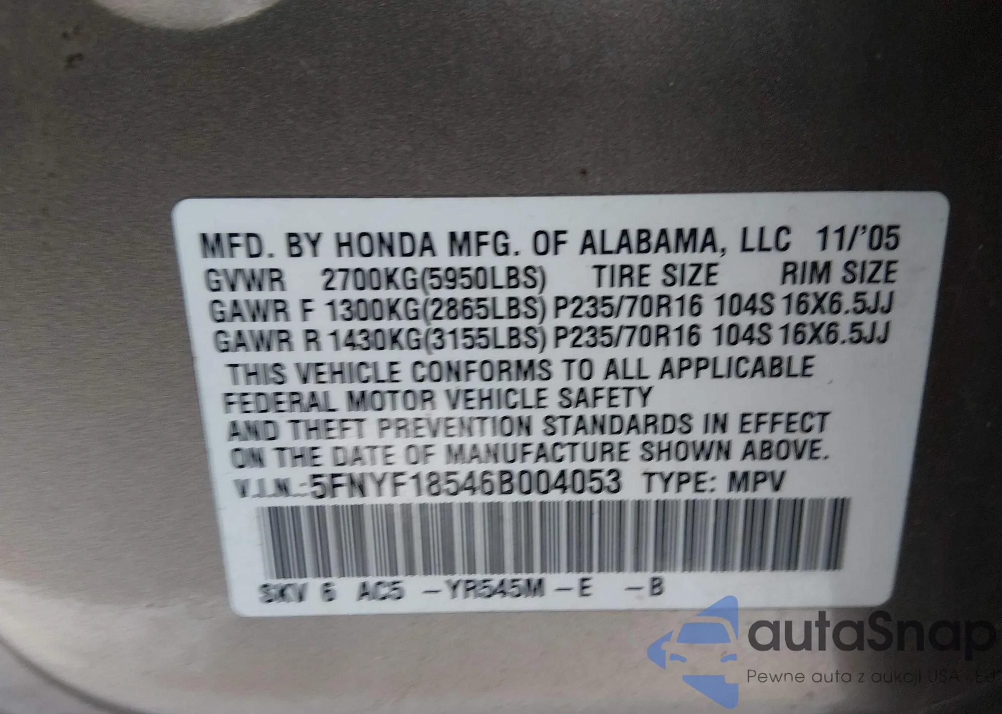• VIN: 5FNYF18546B004053