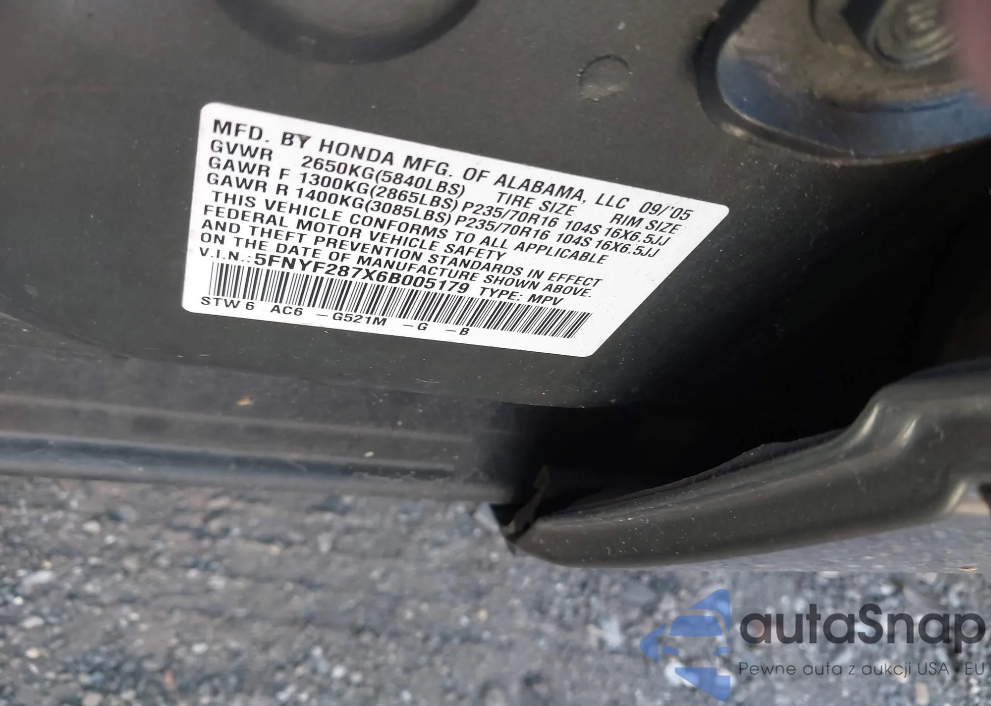 VIN: 5FNYF287X6B005179