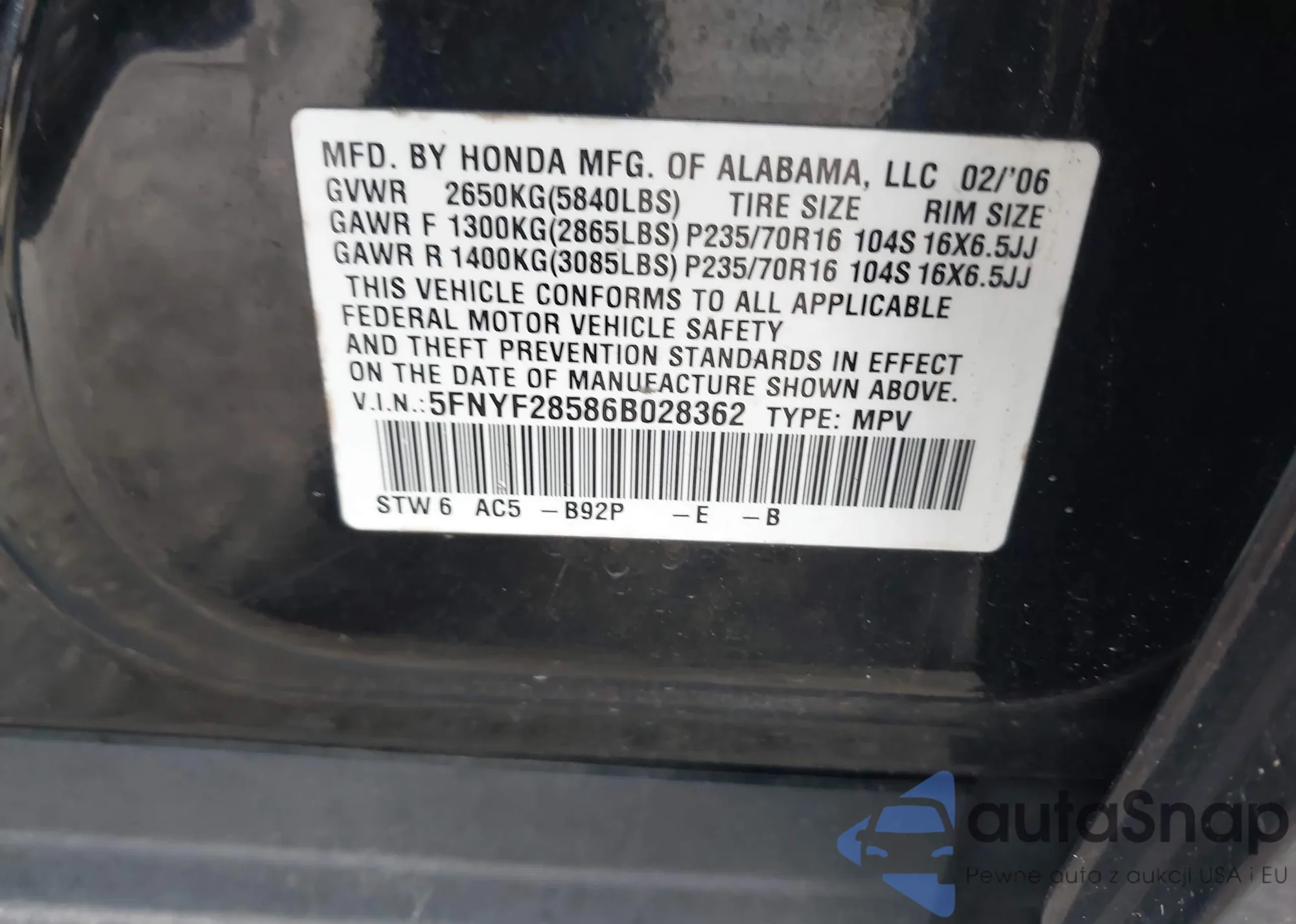 VIN: 5FNYF28586B028362