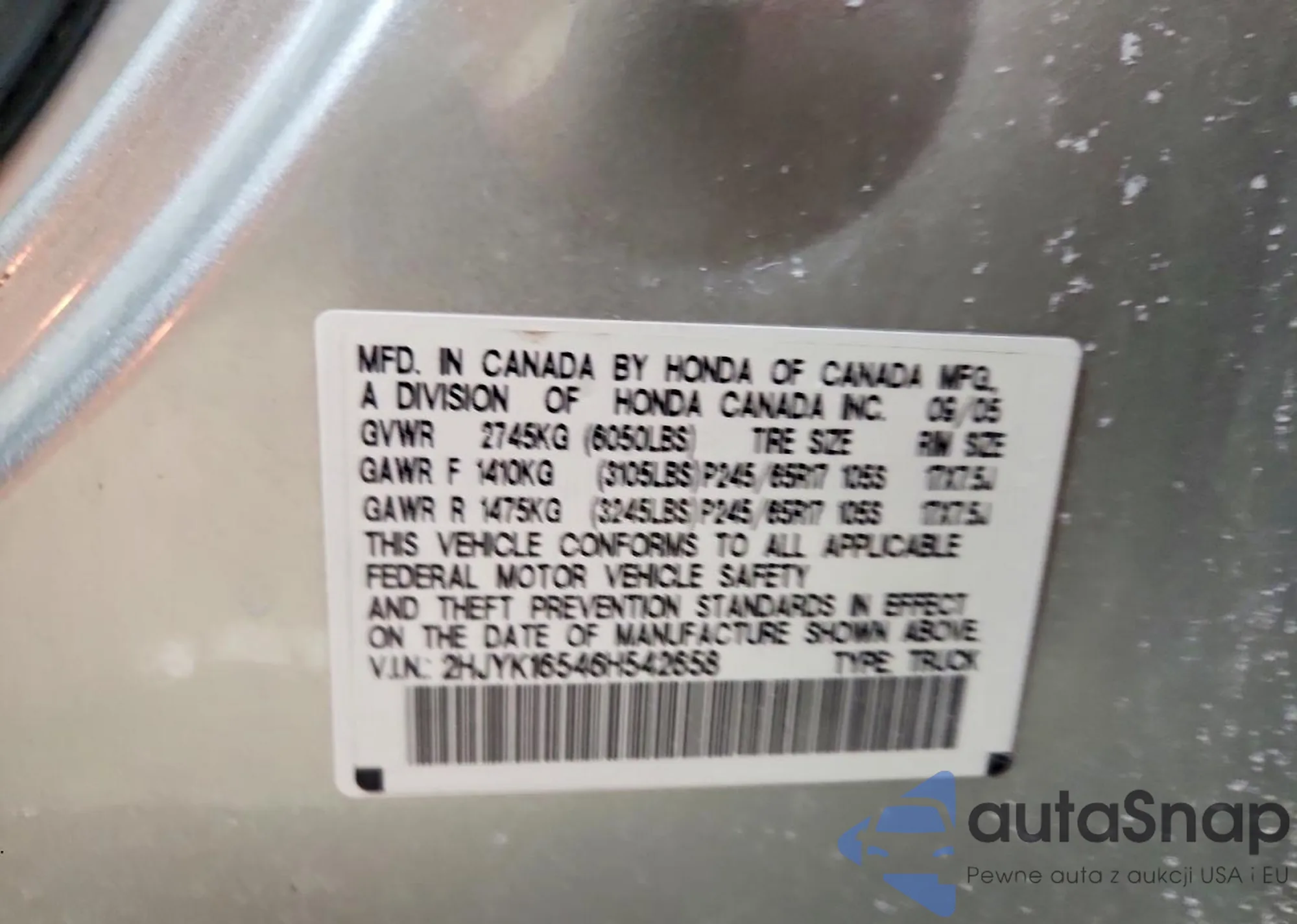 Samochód Honda Ridgeline 2006 (VIN 2HJYK16546H542658) ma dokumenty uniemożliwiające rejestrację. Mogą pojawić się trudności przy eksporcie i rejestracji. Skontaktuj się z ekspertami AutaSnap w celu znalezienia alternatywy.