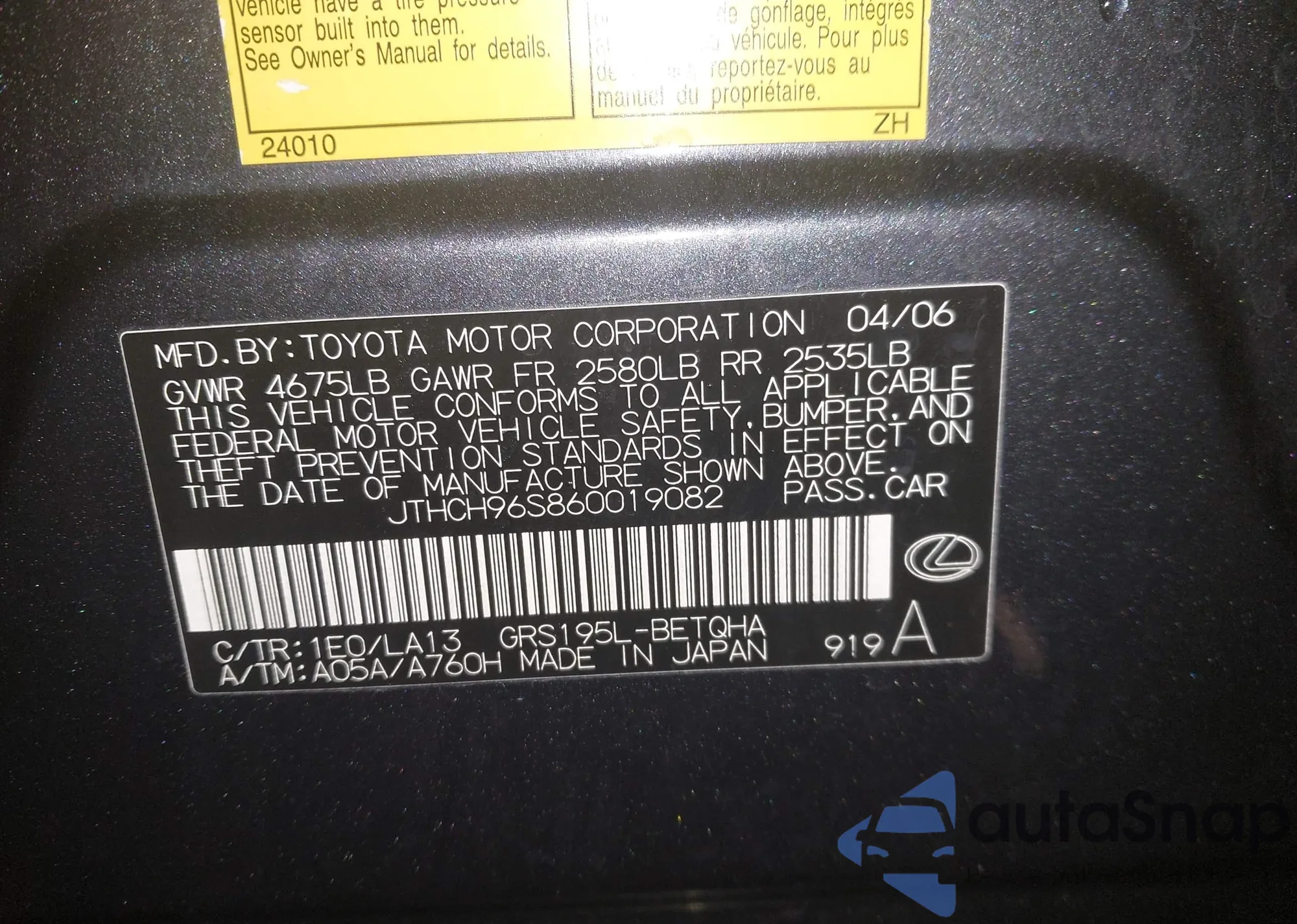 VIN: JTHCH96S860019082