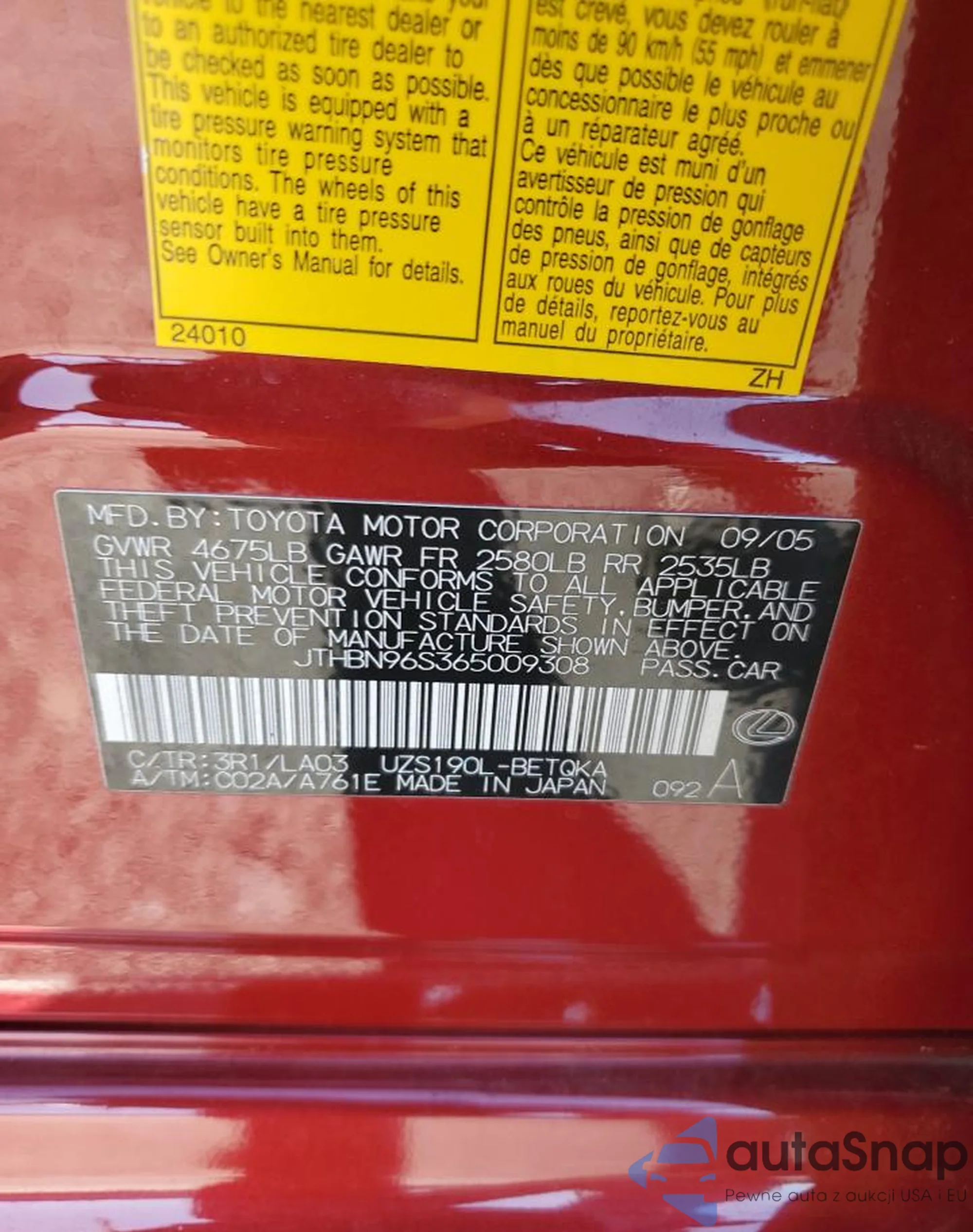 Samochód Lexus GS 2006 (VIN JTHBN96S365009308) nie był wcześniej licytowany. Dokumenty są czyste, przebieg odpowiada lub jest niższy niż średnia rynku. Sprzedaje go firma ubezpieczeniowa – polecamy zakup. Dostawa do portu zajmie ok. 6–8 tygodni.