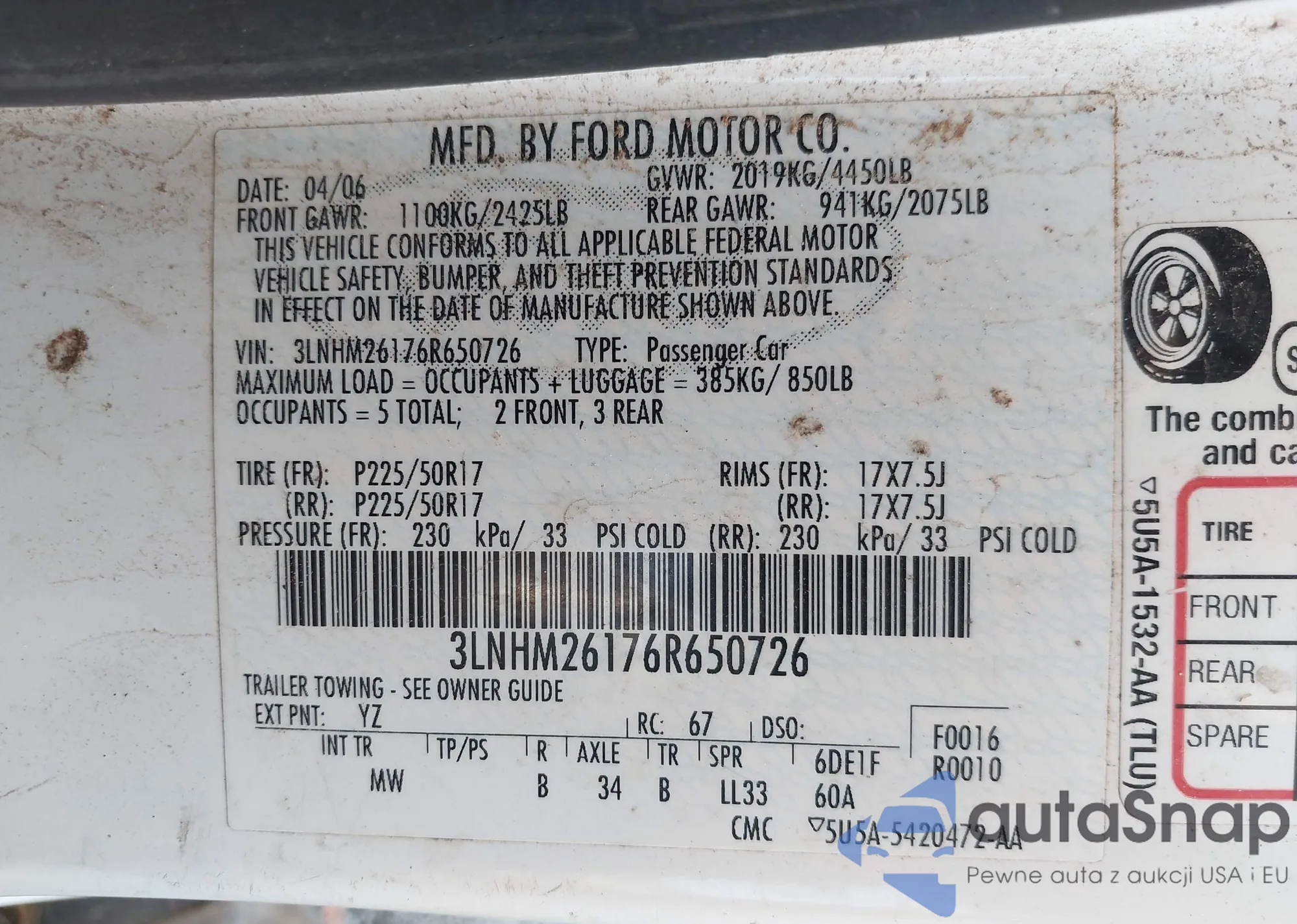 Samochód Lincoln Zephyr 2006 (VIN 3LNHM26176R650726) ma dokumenty uniemożliwiające rejestrację. Mogą pojawić się trudności przy eksporcie i rejestracji. Skontaktuj się z ekspertami AutaSnap w celu znalezienia alternatywy.