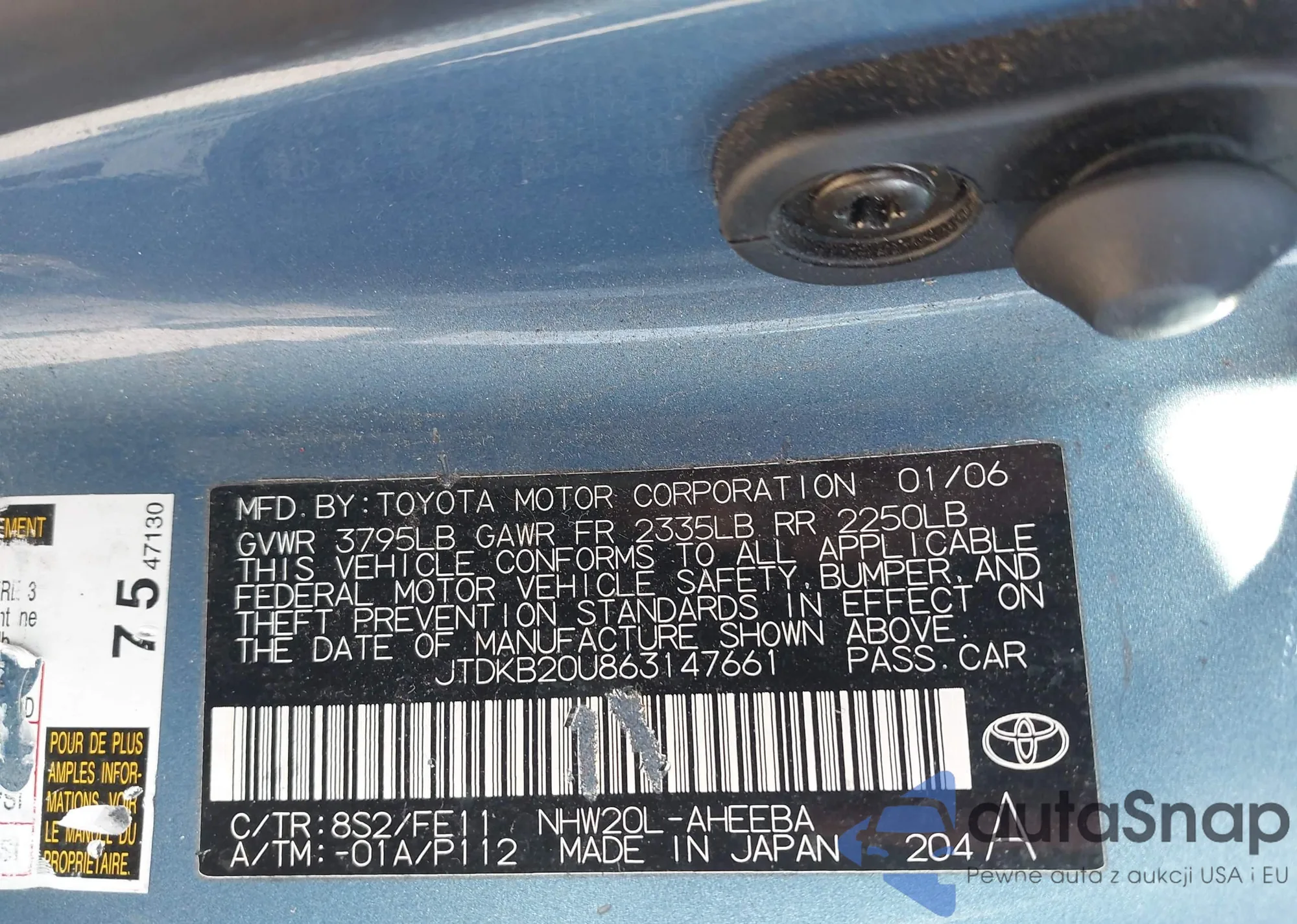 Samochód Toyota Prius 2006 (VIN JTDKB20U863147661) nie był wcześniej licytowany. Dokumenty są czyste, przebieg odpowiada lub jest niższy niż średnia rynku. Sprzedaje go firma ubezpieczeniowa – polecamy zakup. Dostawa do portu zajmie ok. 6–8 tygodni.