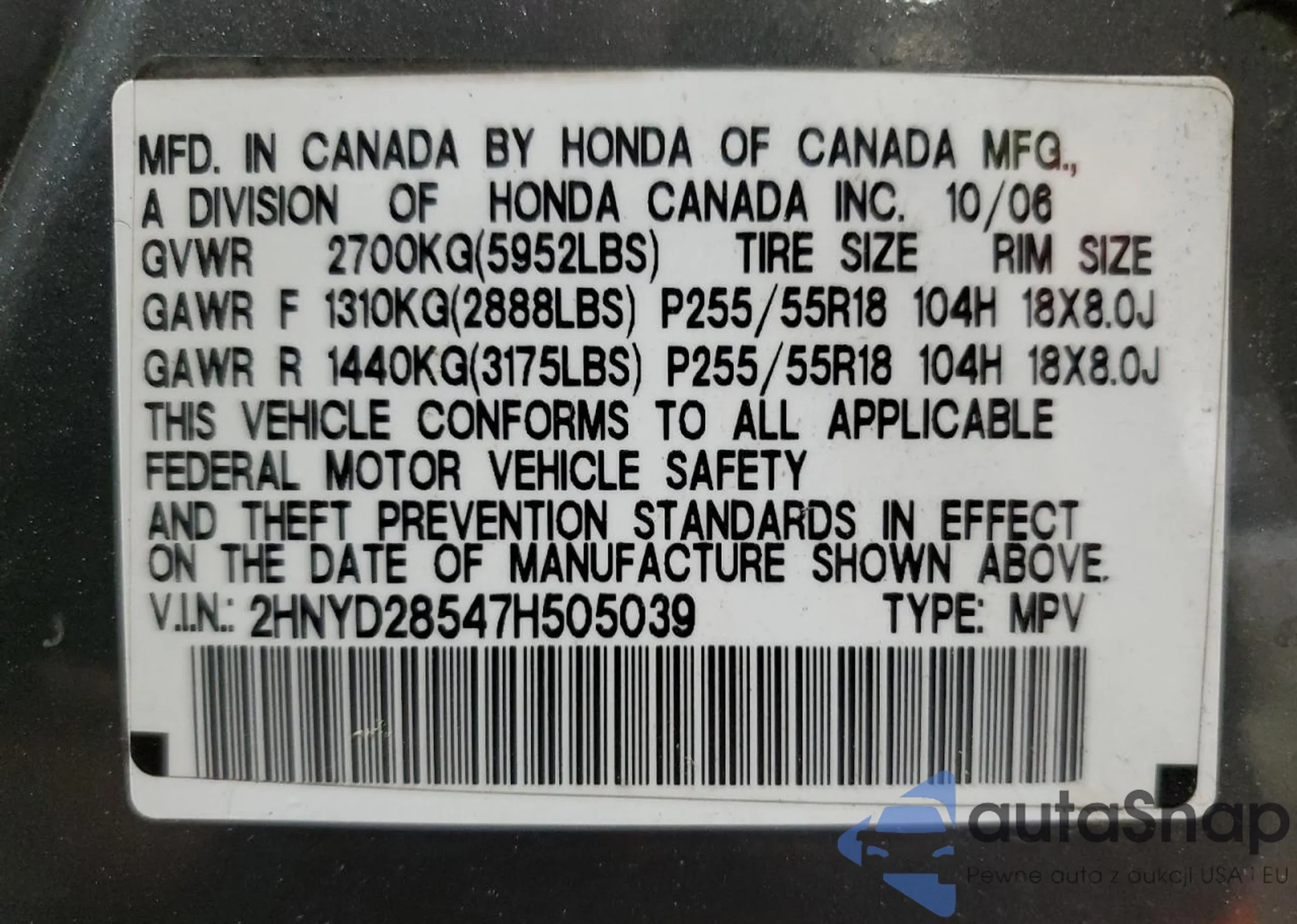 VIN: 2HNYD28547H505039