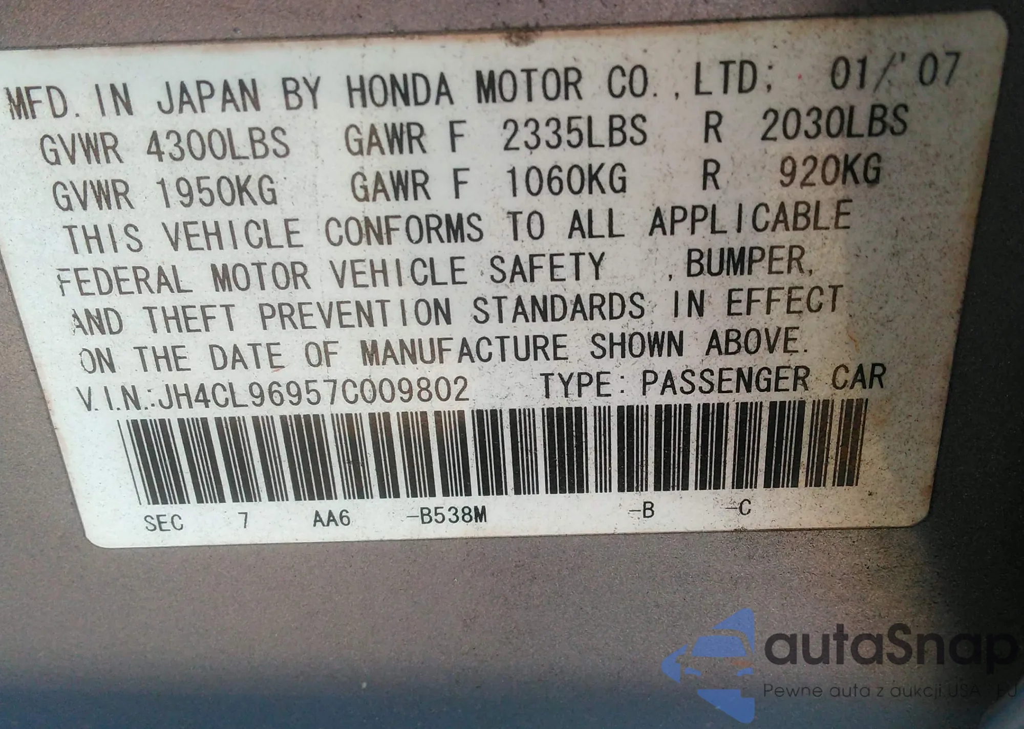 VIN: JH4CL96957C009802