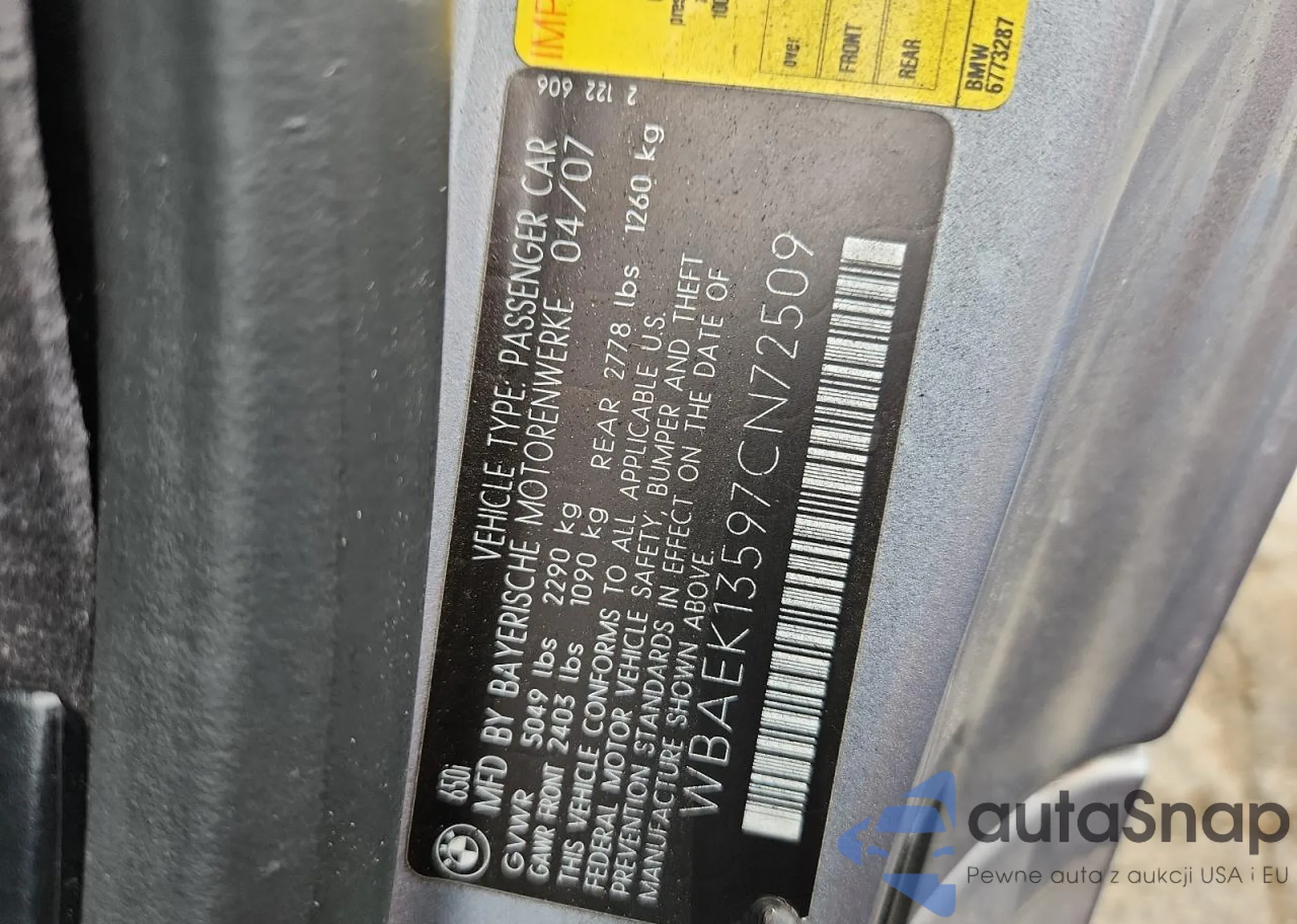 Samochód BMW 6er 2007 (VIN WBAEK13597CN72509) sprzedaje go niezweryfikowany sprzedawca. Zalecamy raport Carfax i potwierdzenie możliwości rejestracji pojazdu przed zakupem.