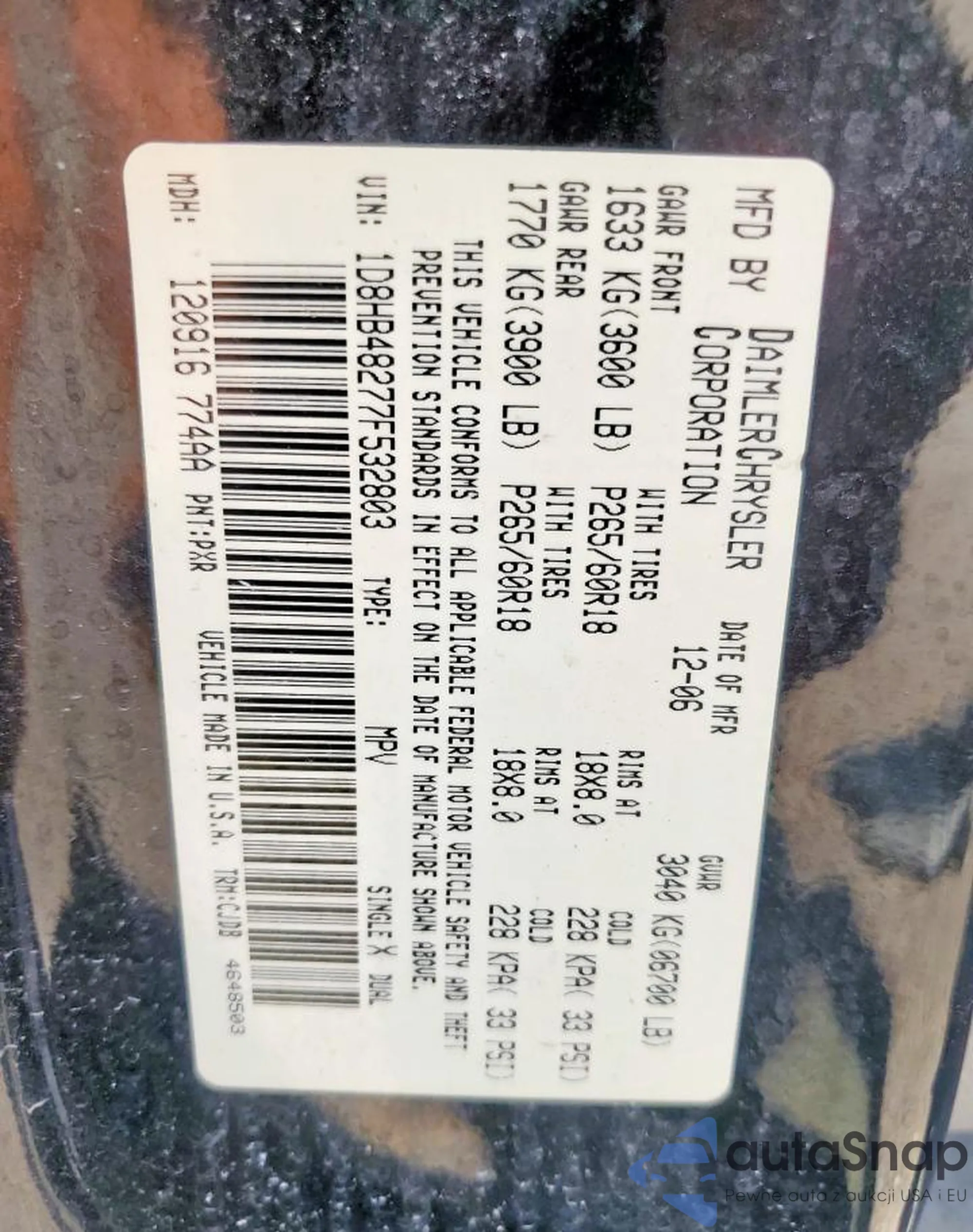 Samochód Dodge Durango 2007 (VIN 1D8HB48277F532803) ma dokumenty uniemożliwiające rejestrację. Mogą pojawić się trudności przy eksporcie i rejestracji. Skontaktuj się z ekspertami AutaSnap w celu znalezienia alternatywy.