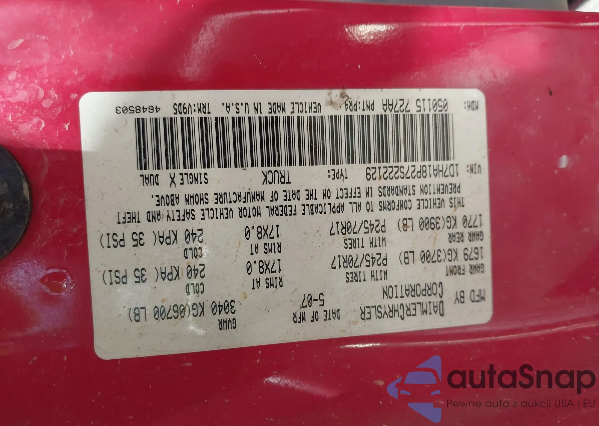 Samochód Dodge RAM 2007 (VIN 1D7HA18P27S222129) sprzedaje go niezweryfikowany sprzedawca. Zalecamy raport Carfax i potwierdzenie możliwości rejestracji pojazdu przed zakupem.