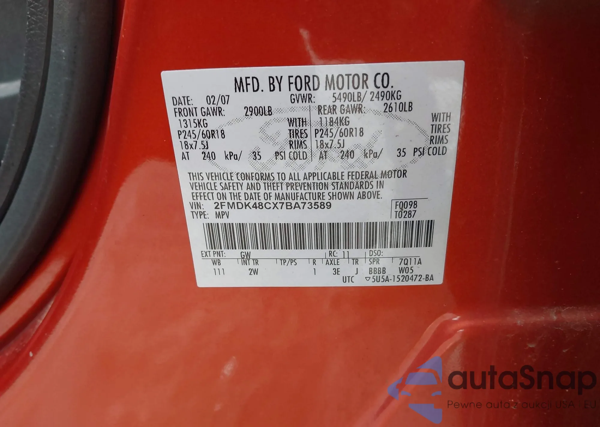 Samochód Ford Edge 2007 (VIN 2FMDK48CX7BA73589) sprzedaje go niezweryfikowany sprzedawca. Zalecamy raport Carfax i potwierdzenie możliwości rejestracji pojazdu przed zakupem.