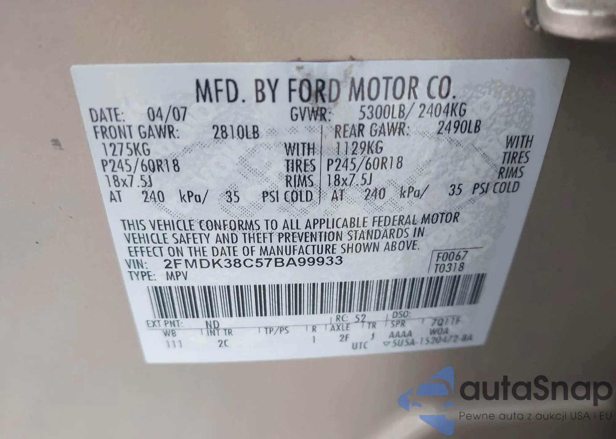 Samochód Ford Edge 2007 (VIN 2FMDK38C57BA99933) nie był wcześniej licytowany. Dokumenty są czyste, przebieg odpowiada lub jest niższy niż średnia rynku. Sprzedaje go firma ubezpieczeniowa – polecamy zakup. Dostawa do portu zajmie ok. 6–8 tygodni.