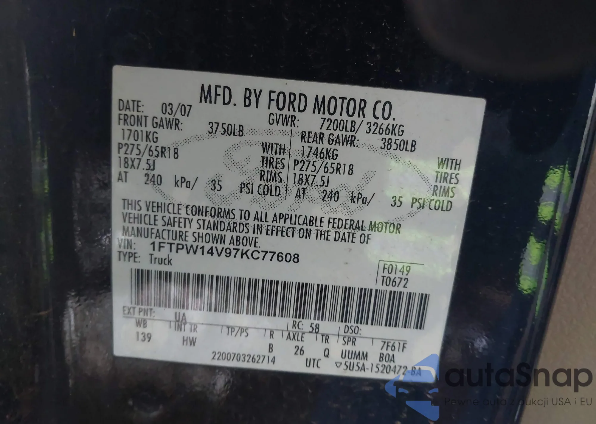 VIN: 1FTPW14V97KC77608