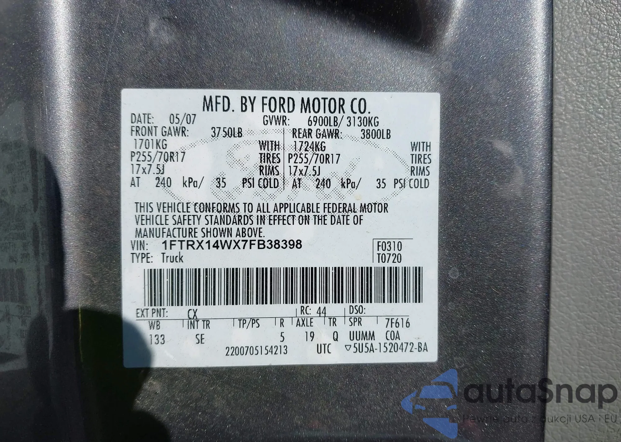 VIN: 1FTRX14WX7FB38398
