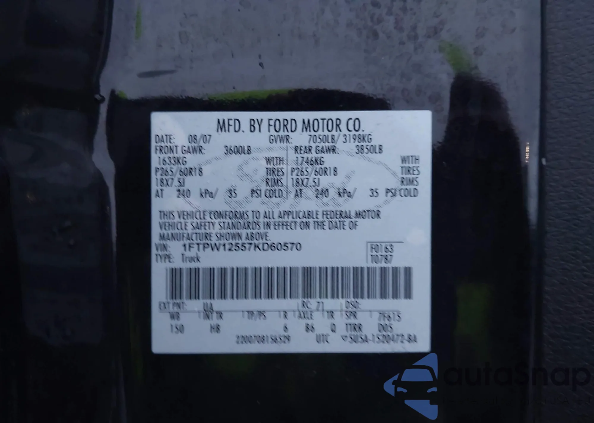 VIN: 1FTPW12557KD60570