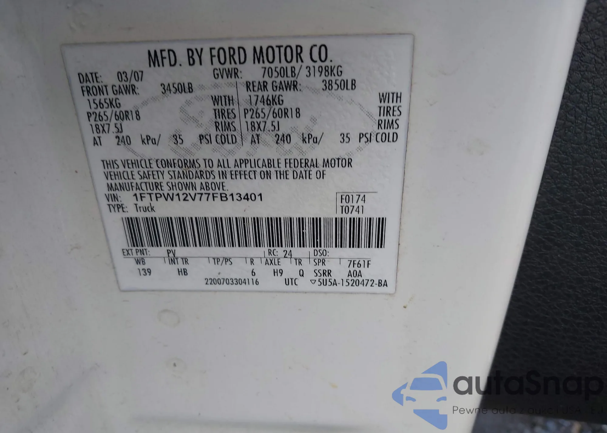 • VIN: 1FTPW12V77FB13401