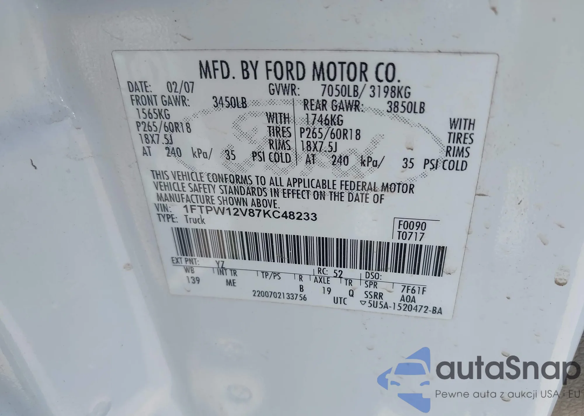 VIN: 1FTPW12V87KC48233