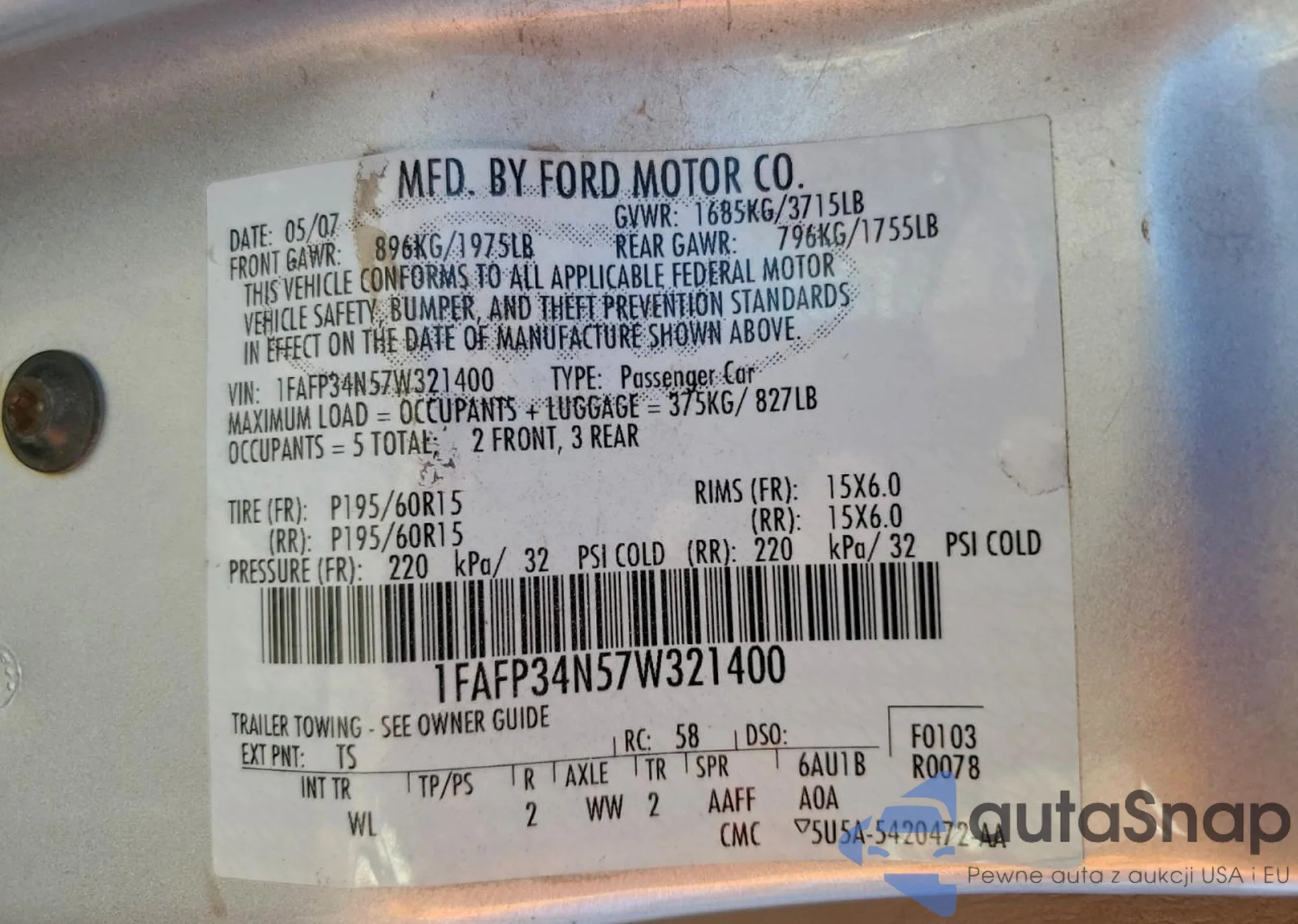 Samochód Ford Focus 2007 (VIN 1FAFP34N57W321400) nie był wcześniej licytowany. Dokumenty są czyste, przebieg odpowiada lub jest niższy niż średnia rynku. Sprzedaje go firma ubezpieczeniowa – polecamy zakup. Dostawa do portu zajmie ok. 6–8 tygodni.