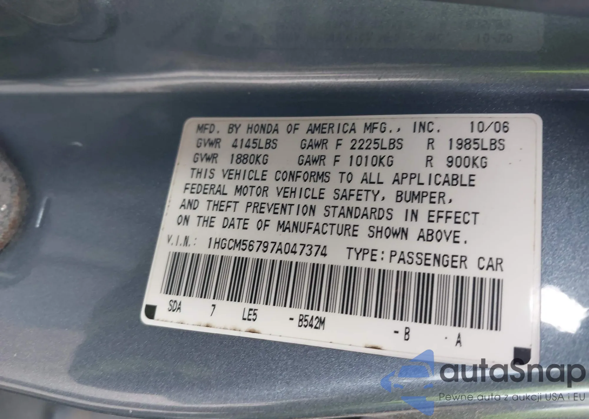 Samochód Honda Accord 2007 (VIN 1HGCM56797A047374) ma dokumenty uniemożliwiające rejestrację. Mogą pojawić się trudności przy eksporcie i rejestracji. Skontaktuj się z ekspertami AutaSnap w celu znalezienia alternatywy.
