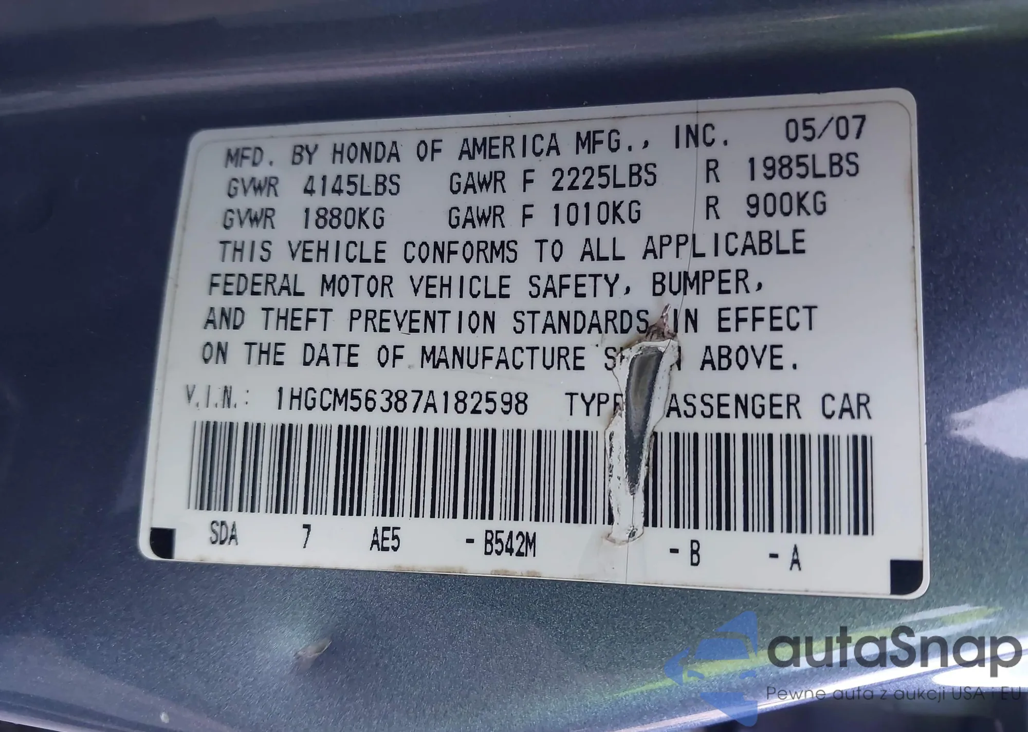 VIN: 1HGCM56387A182598