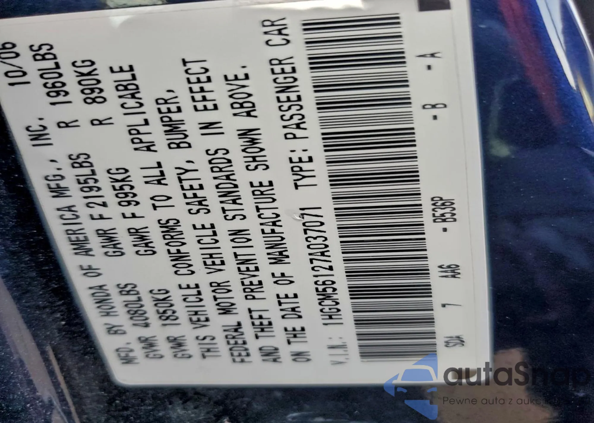 • VIN: 1HGCM56127A037071
