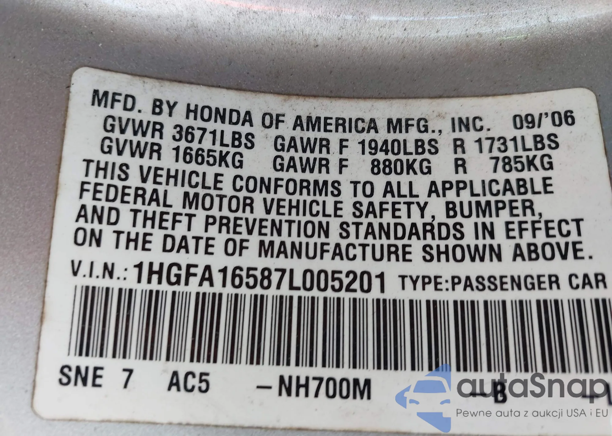 VIN: 1HGFA16587L005201