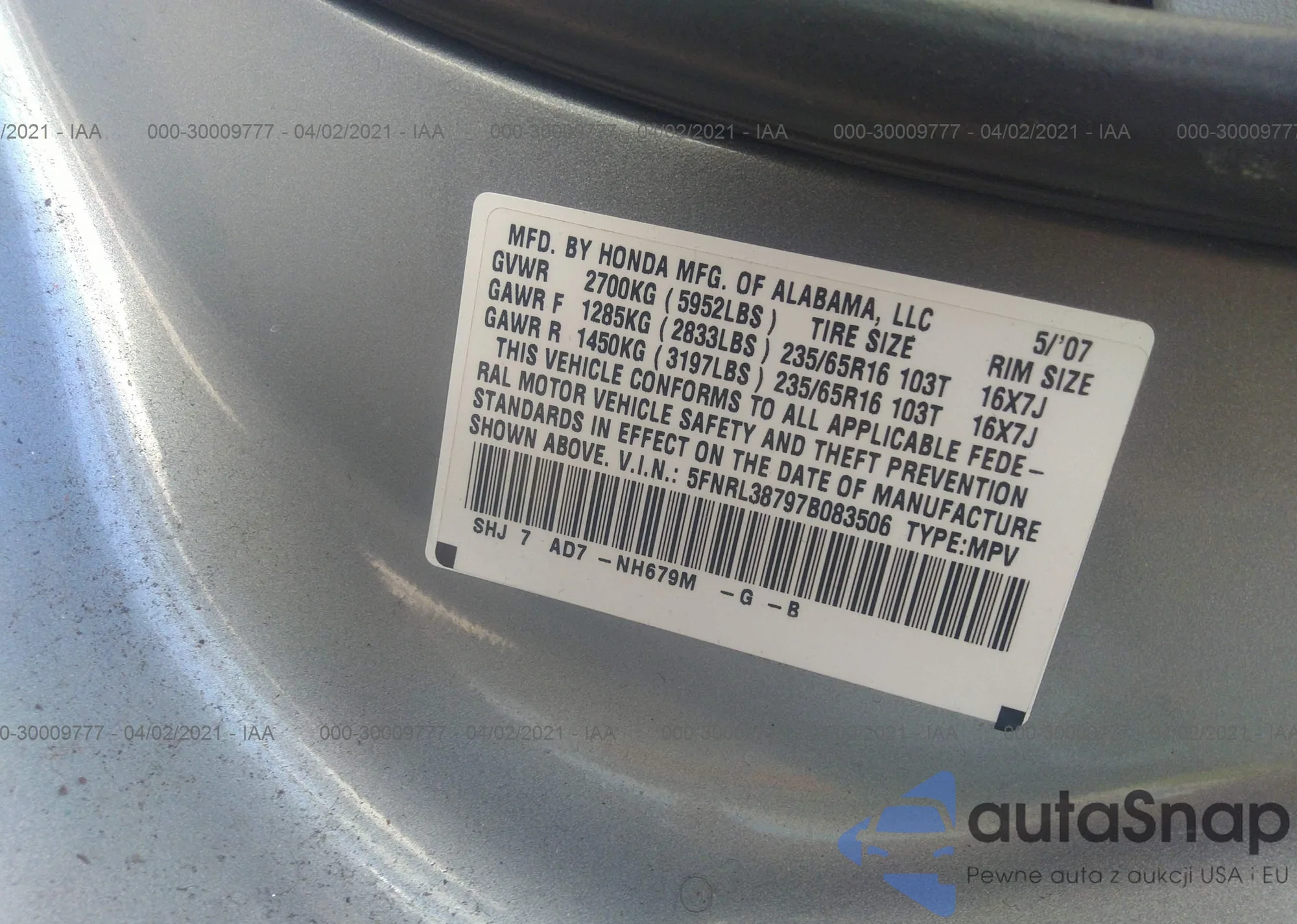 • VIN: 5FNRL38797B083506