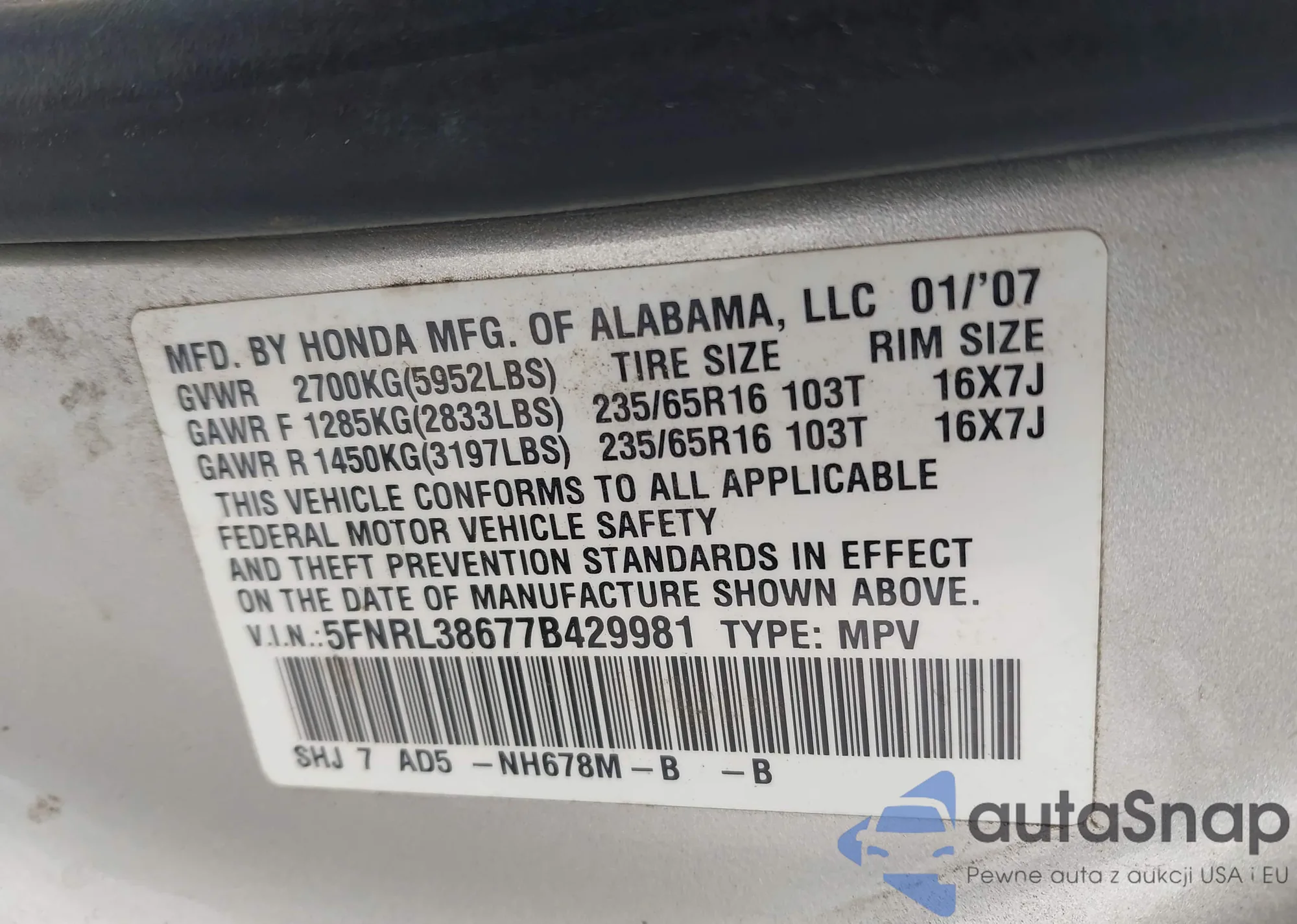 VIN: 5FNRL38677B429981