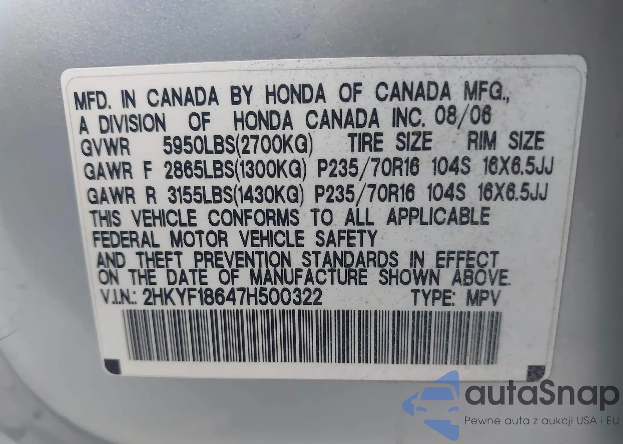 VIN: 2HKYF18647H500322