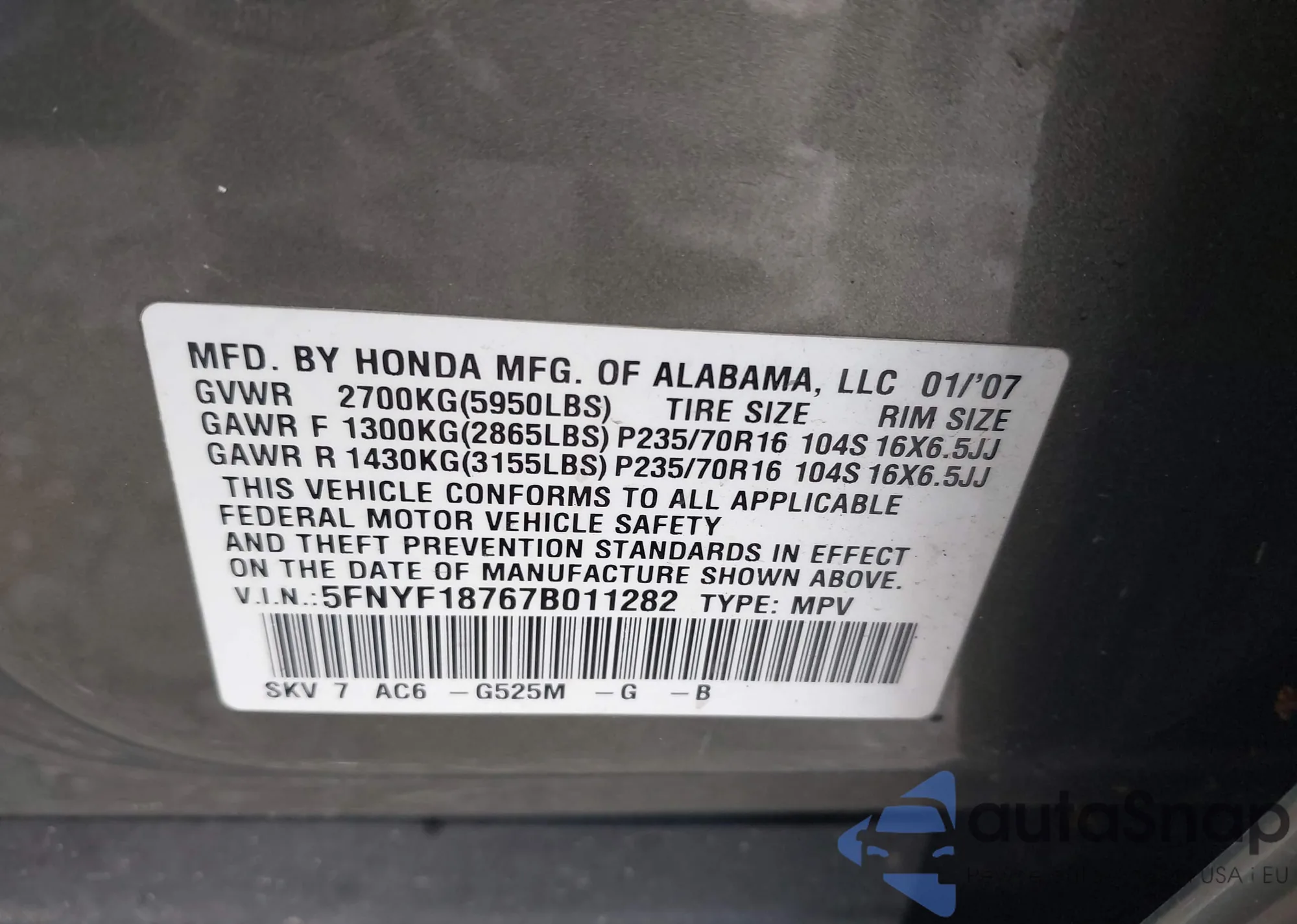 VIN: 5FNYF18767B011282