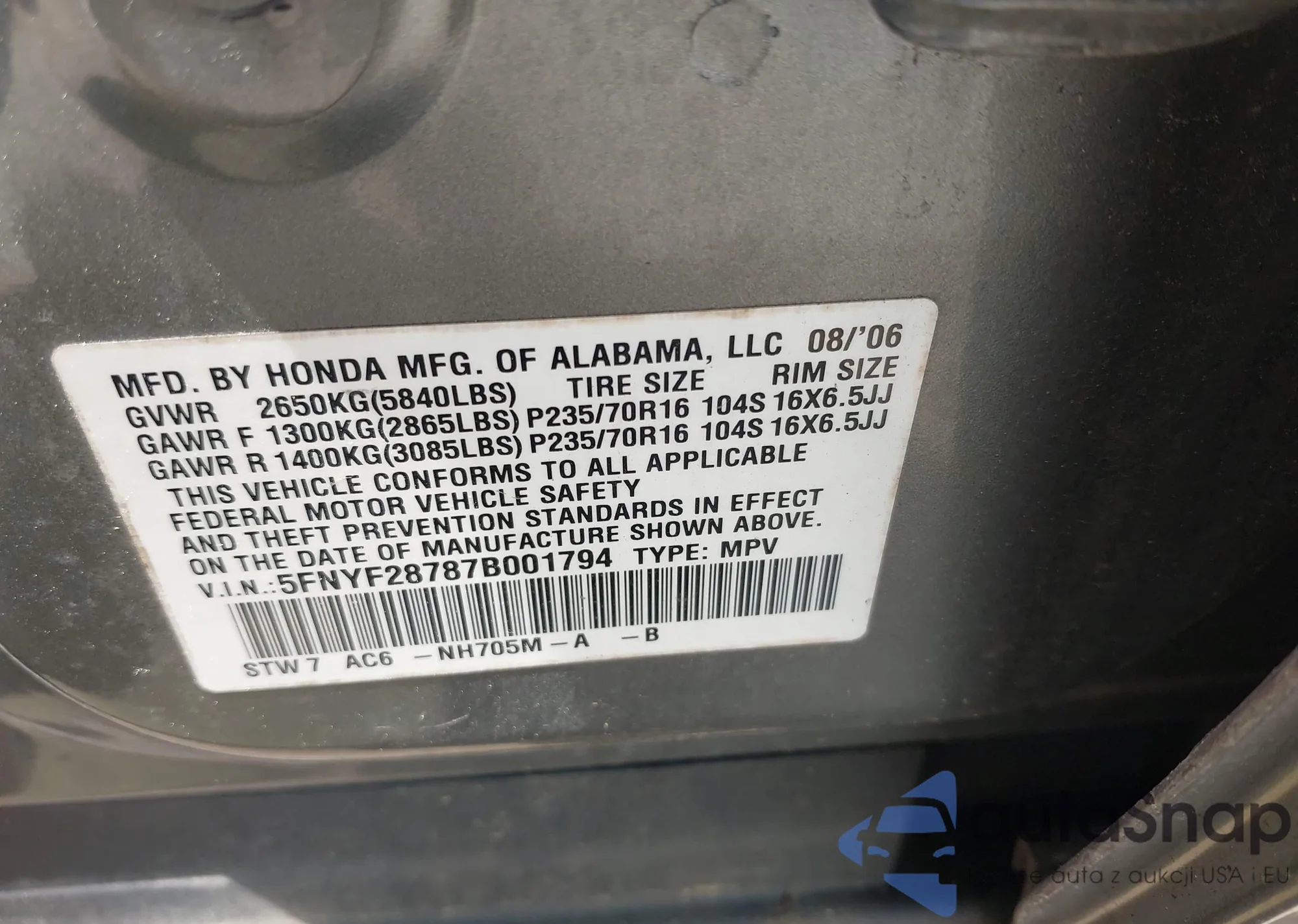VIN: 5FNYF28787B001794