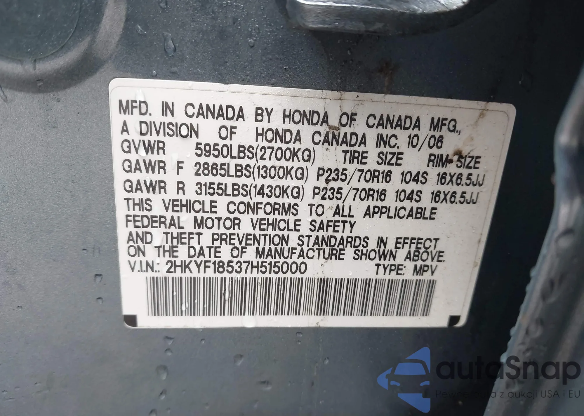 • VIN: 2HKYF18537H515000