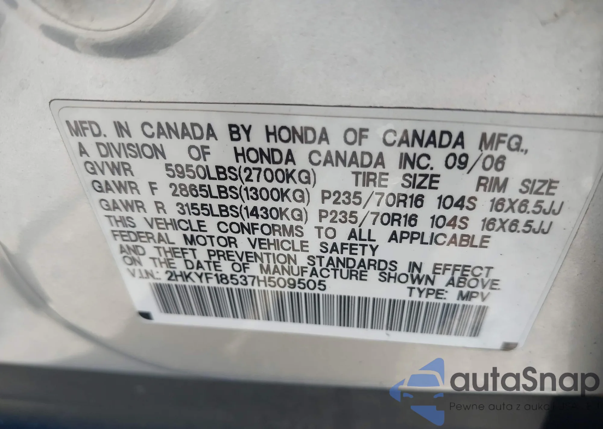 VIN: 2HKYF18537H509505