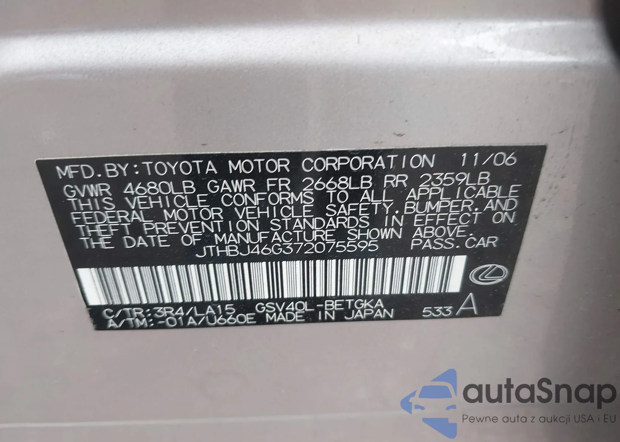 VIN: JTHBJ46G372075595