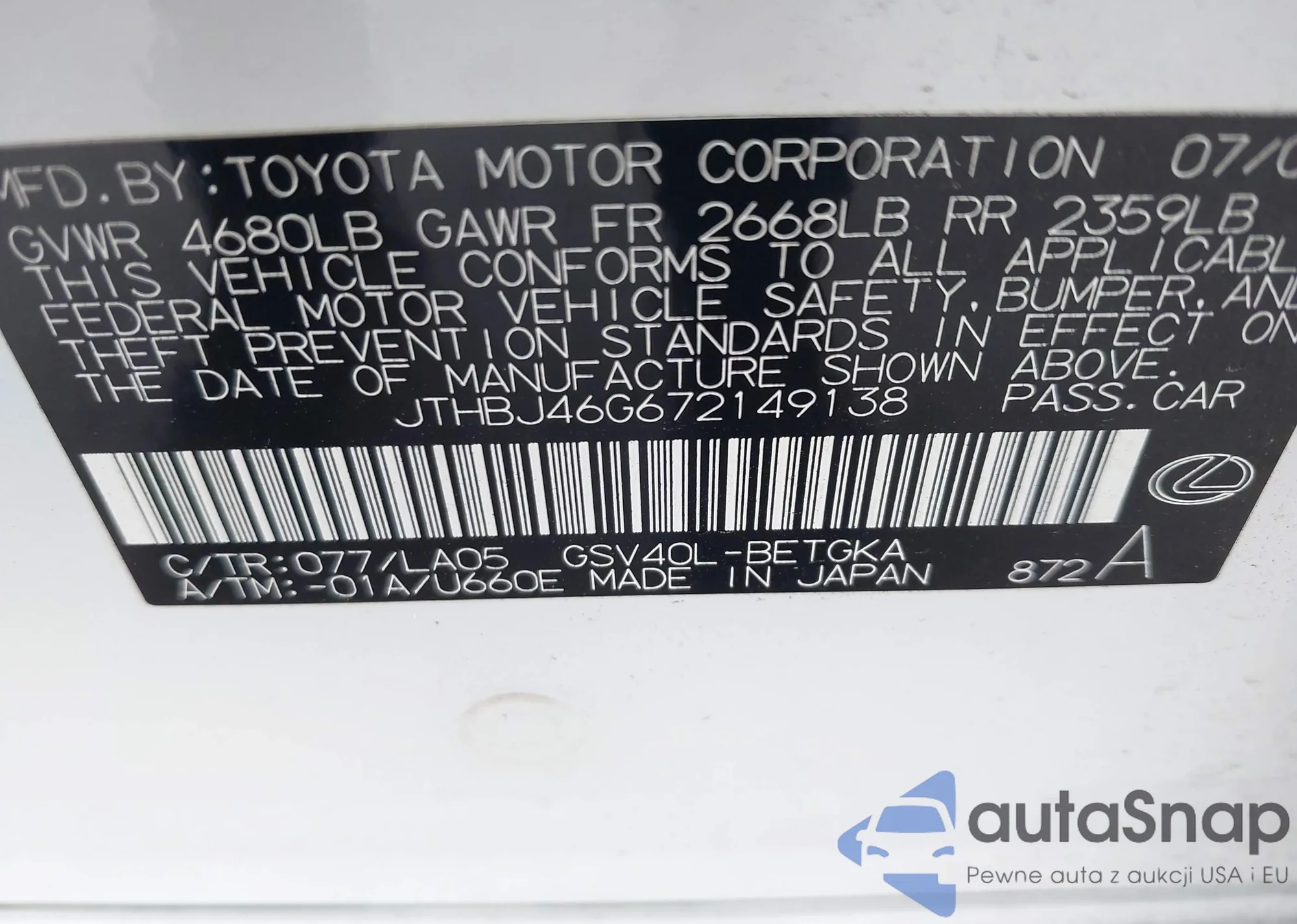 VIN: JTHBJ46G672149138