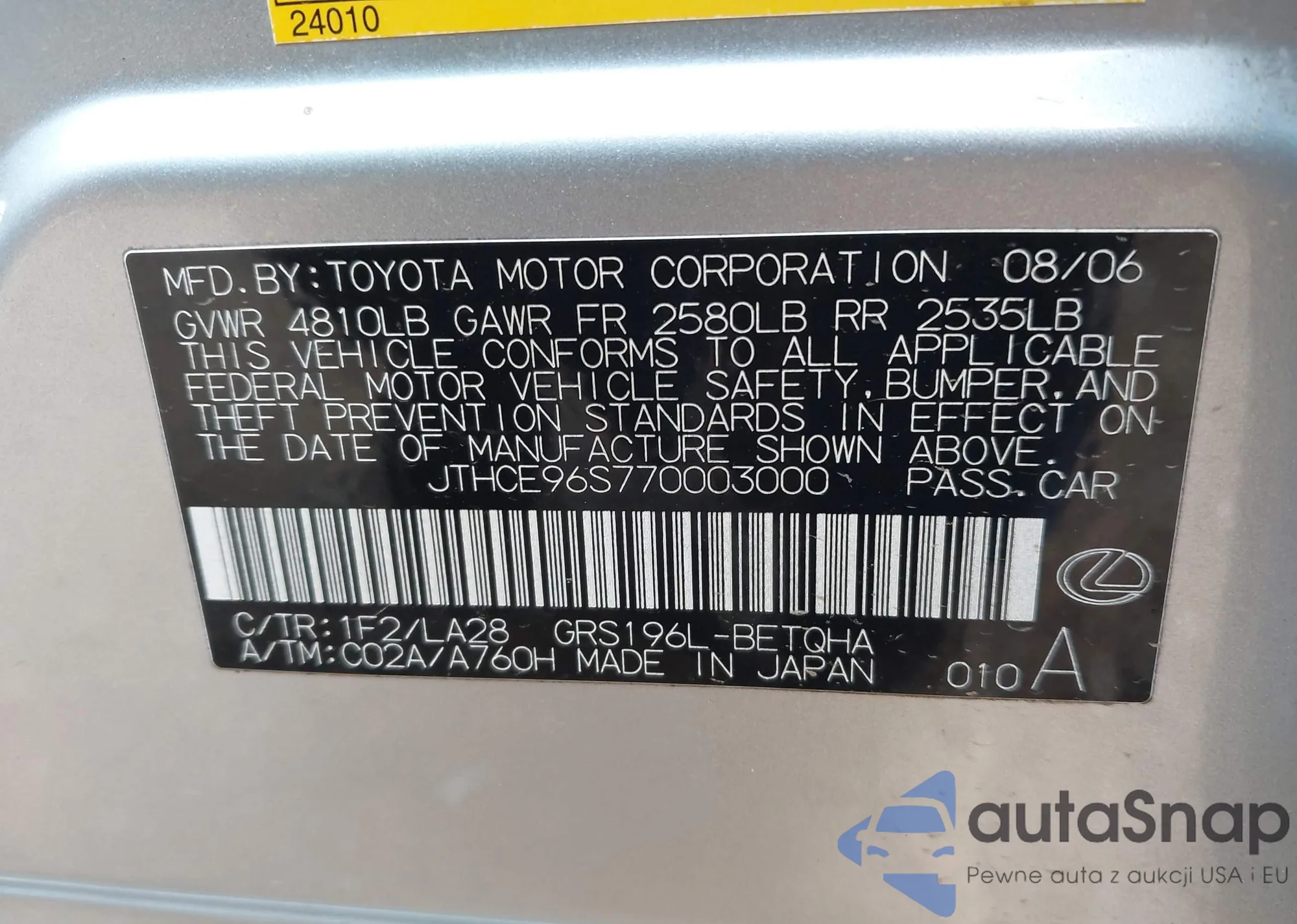 VIN: JTHCE96S770003000