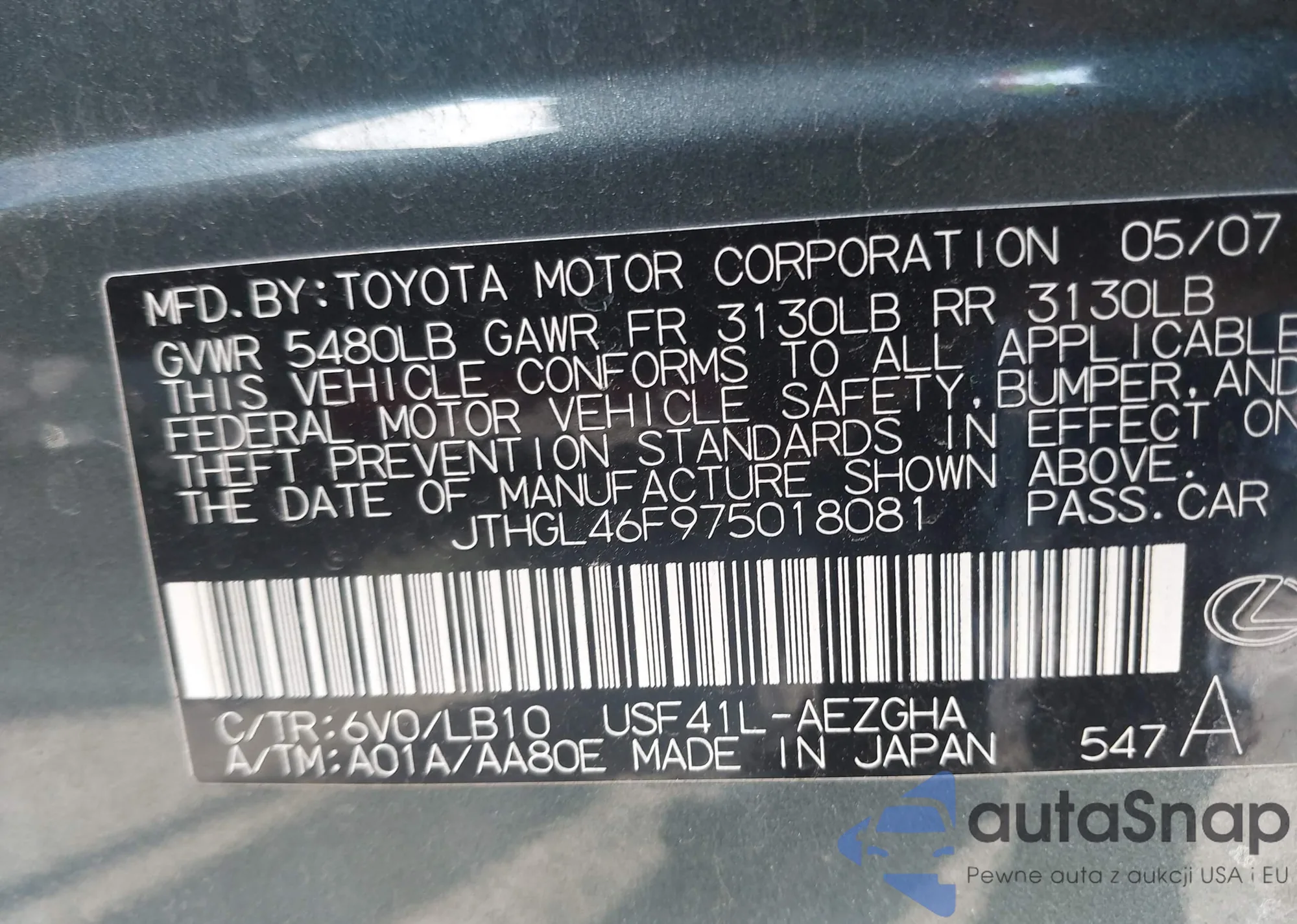 Samochód Lexus LS 2007 (VIN JTHGL46F975018081) nie był wcześniej licytowany. Dokumenty są czyste, przebieg odpowiada lub jest niższy niż średnia rynku. Sprzedaje go firma ubezpieczeniowa – polecamy zakup. Dostawa do portu zajmie ok. 6–8 tygodni.