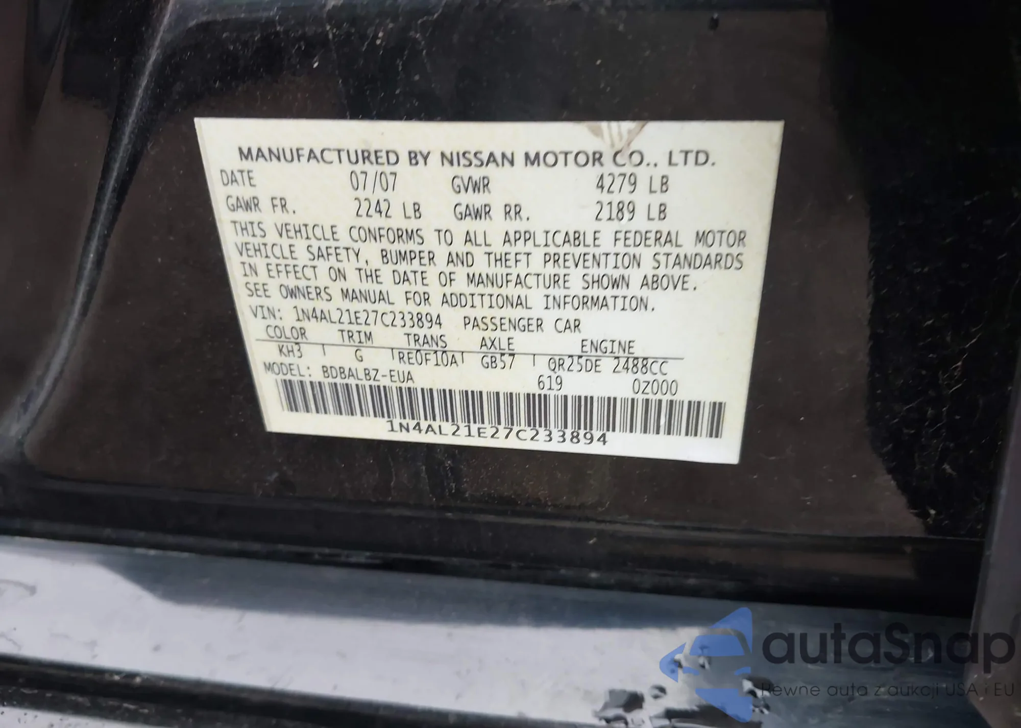 Samochód Nissan Altima 2007 (VIN 1N4AL21E27C233894) nie był wcześniej licytowany. Dokumenty są czyste, przebieg odpowiada lub jest niższy niż średnia rynku. Sprzedaje go firma ubezpieczeniowa – polecamy zakup. Dostawa do portu zajmie ok. 6–8 tygodni.