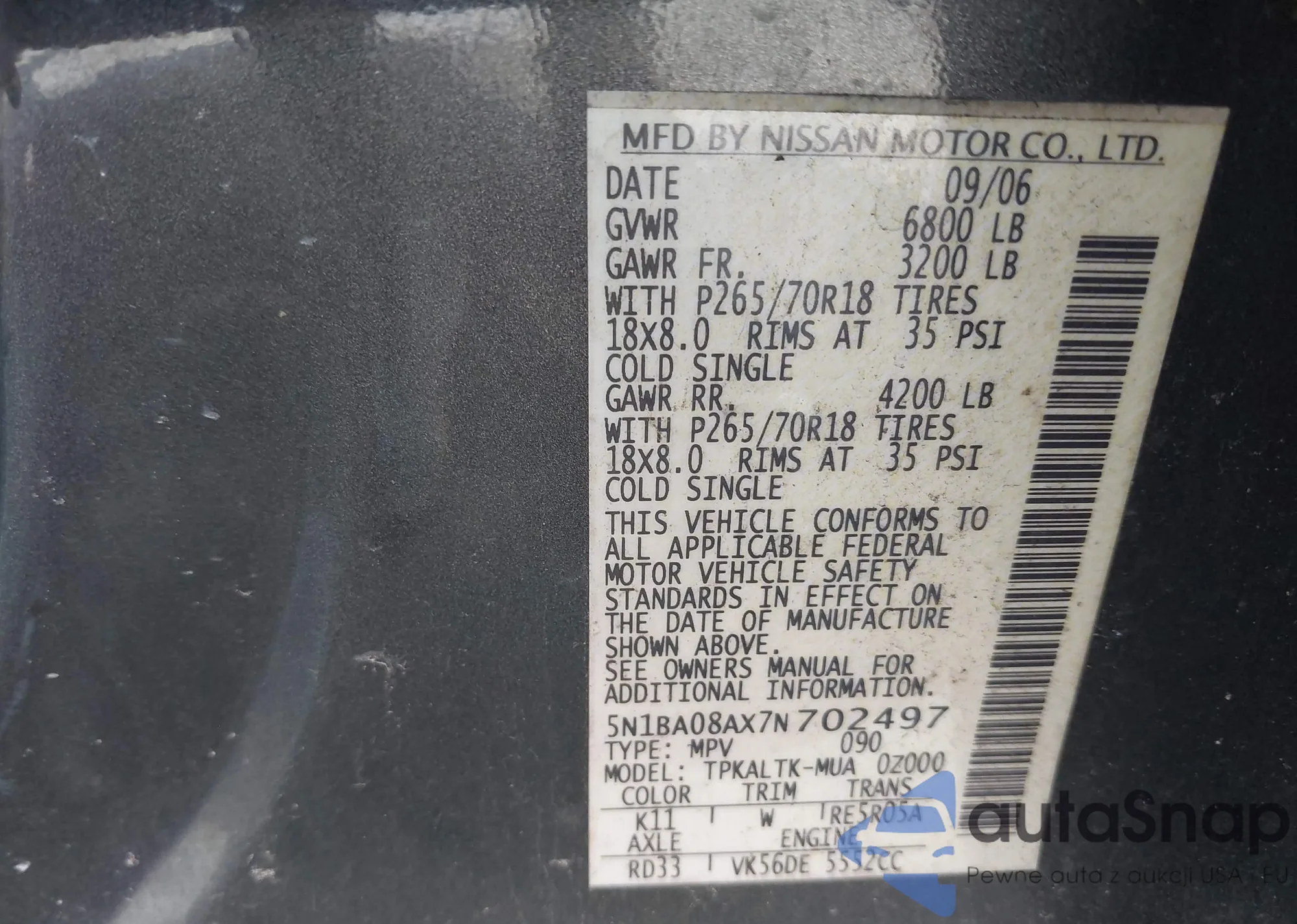 Samochód Nissan Armada 2007 (VIN 5N1BA08AX7N702497) sprzedaje go niezweryfikowany sprzedawca. Zalecamy raport Carfax i potwierdzenie możliwości rejestracji pojazdu przed zakupem.