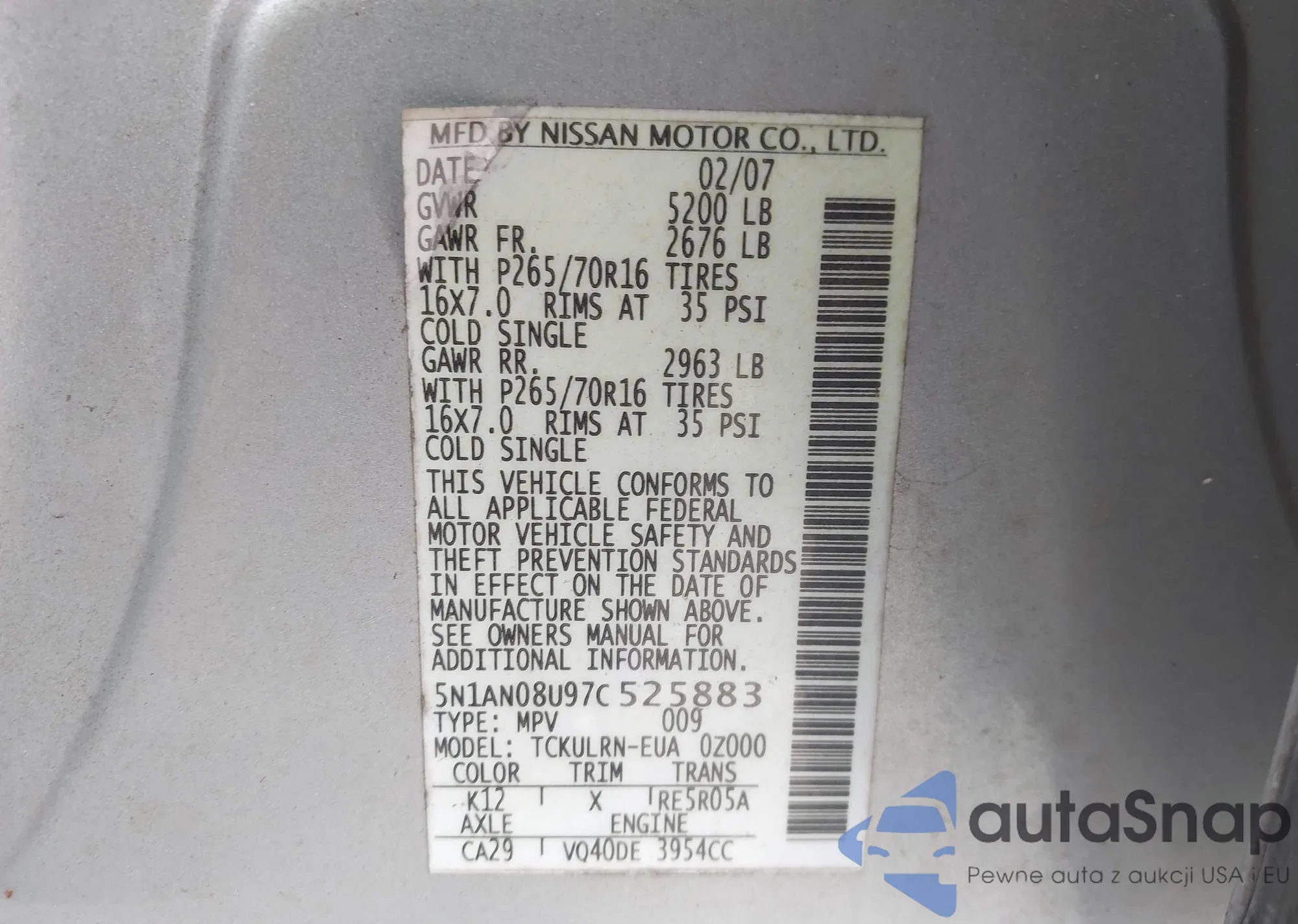 • VIN: 5N1AN08U97C525883