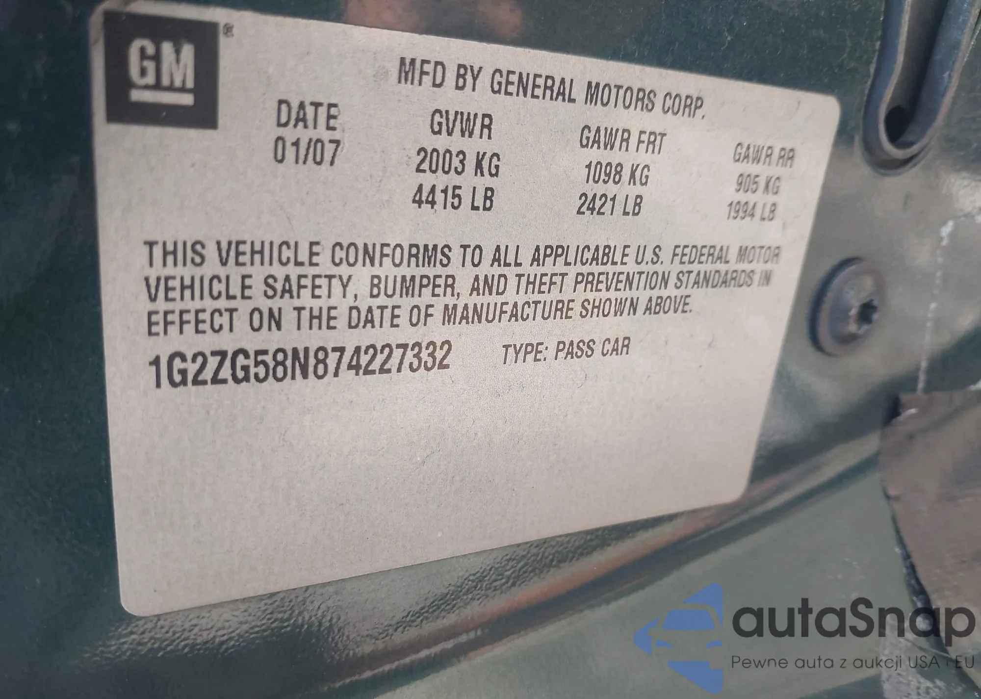 Samochód Pontiac G6 2007 (VIN 1G2ZG58N874227332) ma dokumenty uniemożliwiające rejestrację. Mogą pojawić się trudności przy eksporcie i rejestracji. Skontaktuj się z ekspertami AutaSnap w celu znalezienia alternatywy.