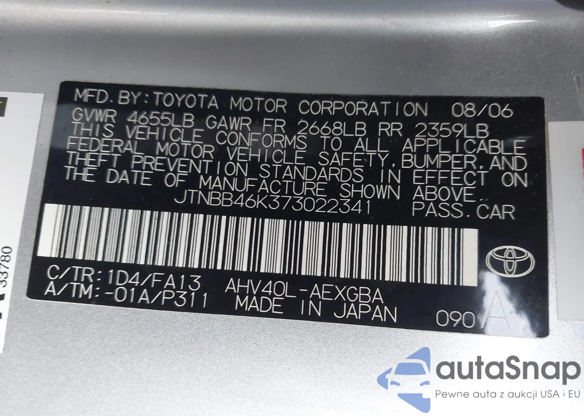 Samochód Toyota Camry 2007 (VIN JTNBB46K373022341) sprzedaje go niezweryfikowany sprzedawca. Zalecamy raport Carfax i potwierdzenie możliwości rejestracji pojazdu przed zakupem.