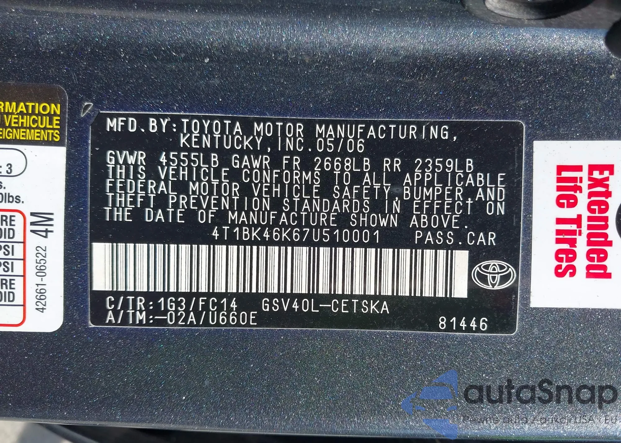 VIN: 4T1BK46K67U510001