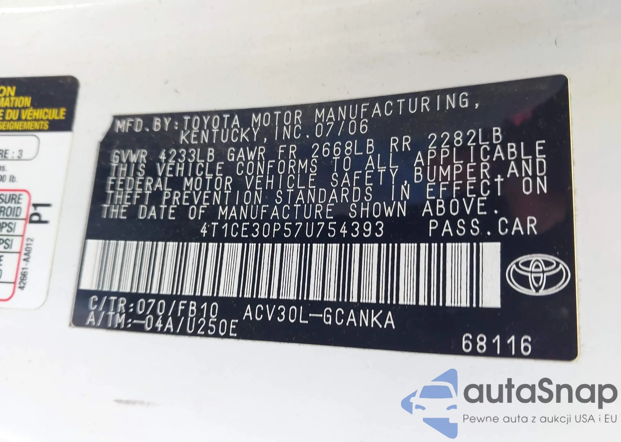 Samochód Toyota Camry Solara 2007 (VIN 4T1CE30P57U754393) sprzedaje go niezweryfikowany sprzedawca. Zalecamy raport Carfax i potwierdzenie możliwości rejestracji pojazdu przed zakupem.