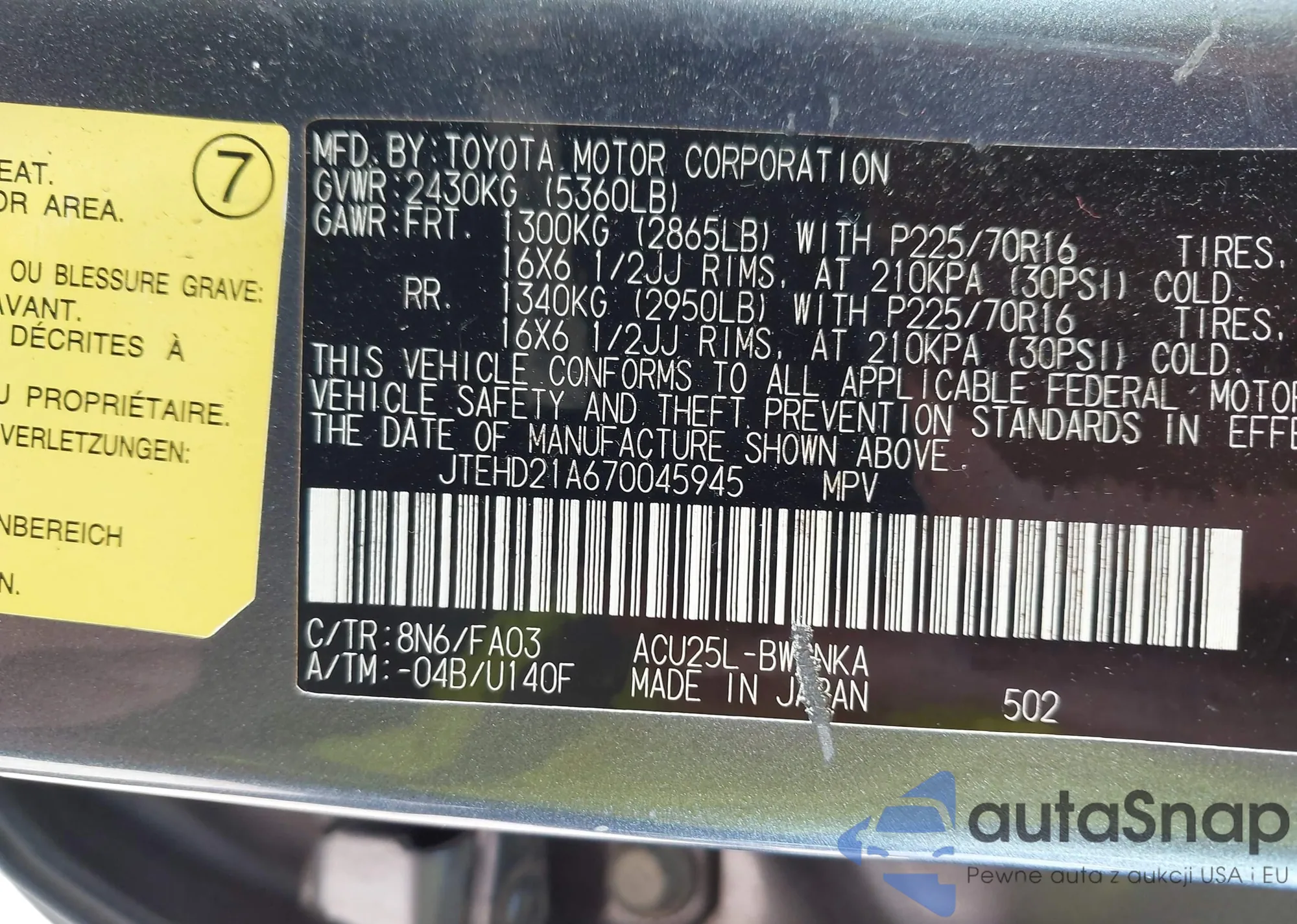 VIN: JTEHD21A670045945
