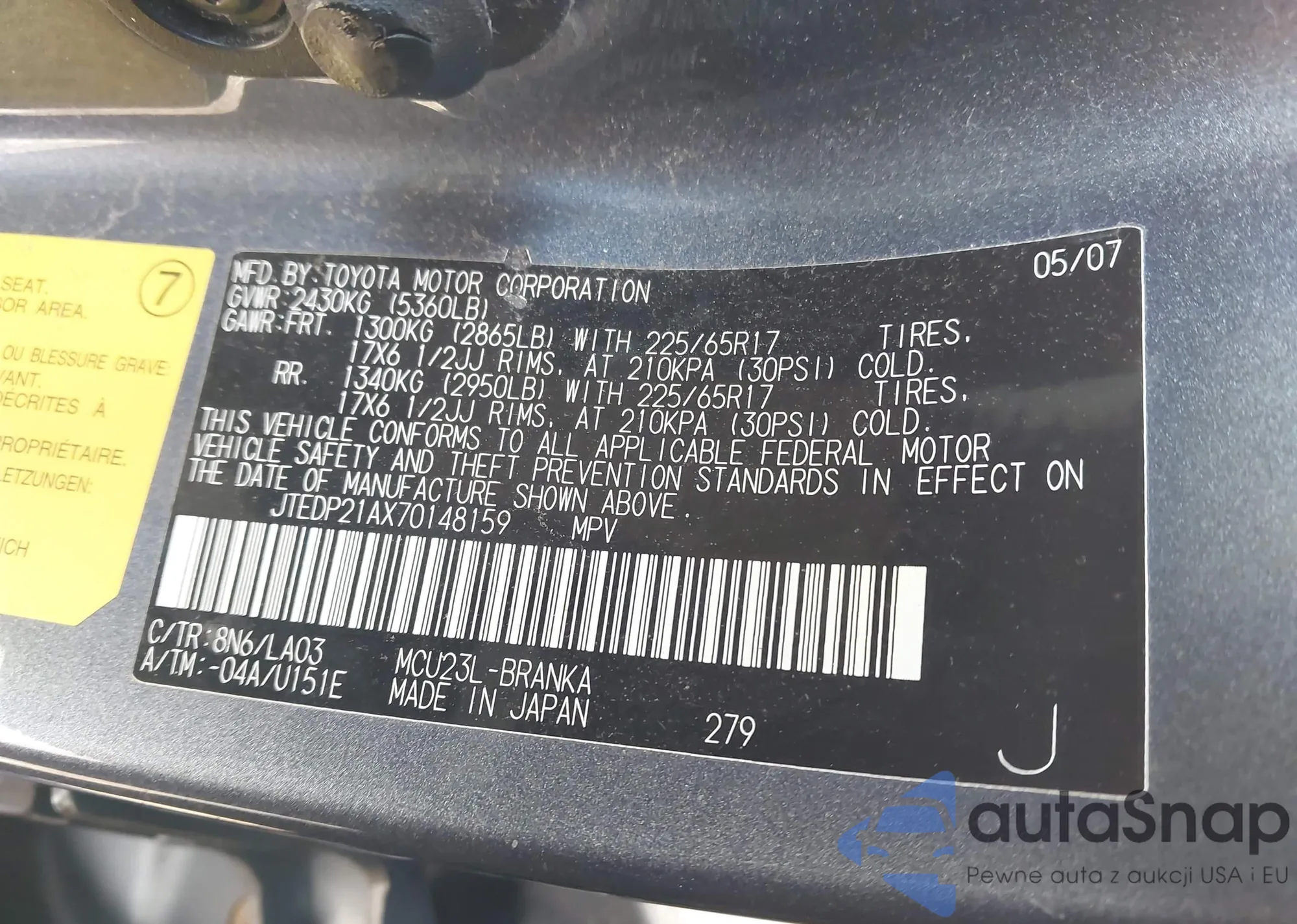 VIN: JTEDP21AX70148159