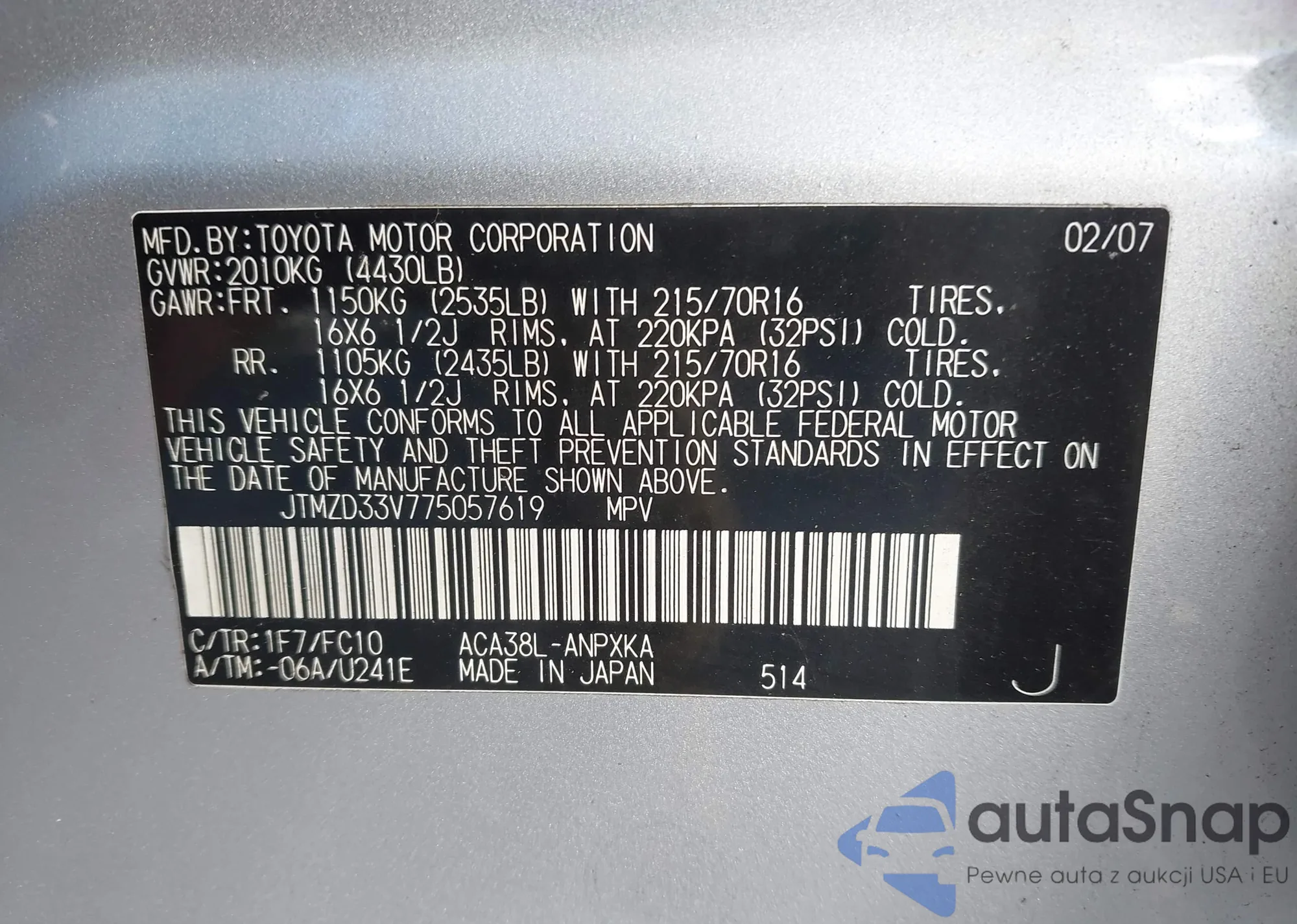 VIN: JTMZD33V775057619