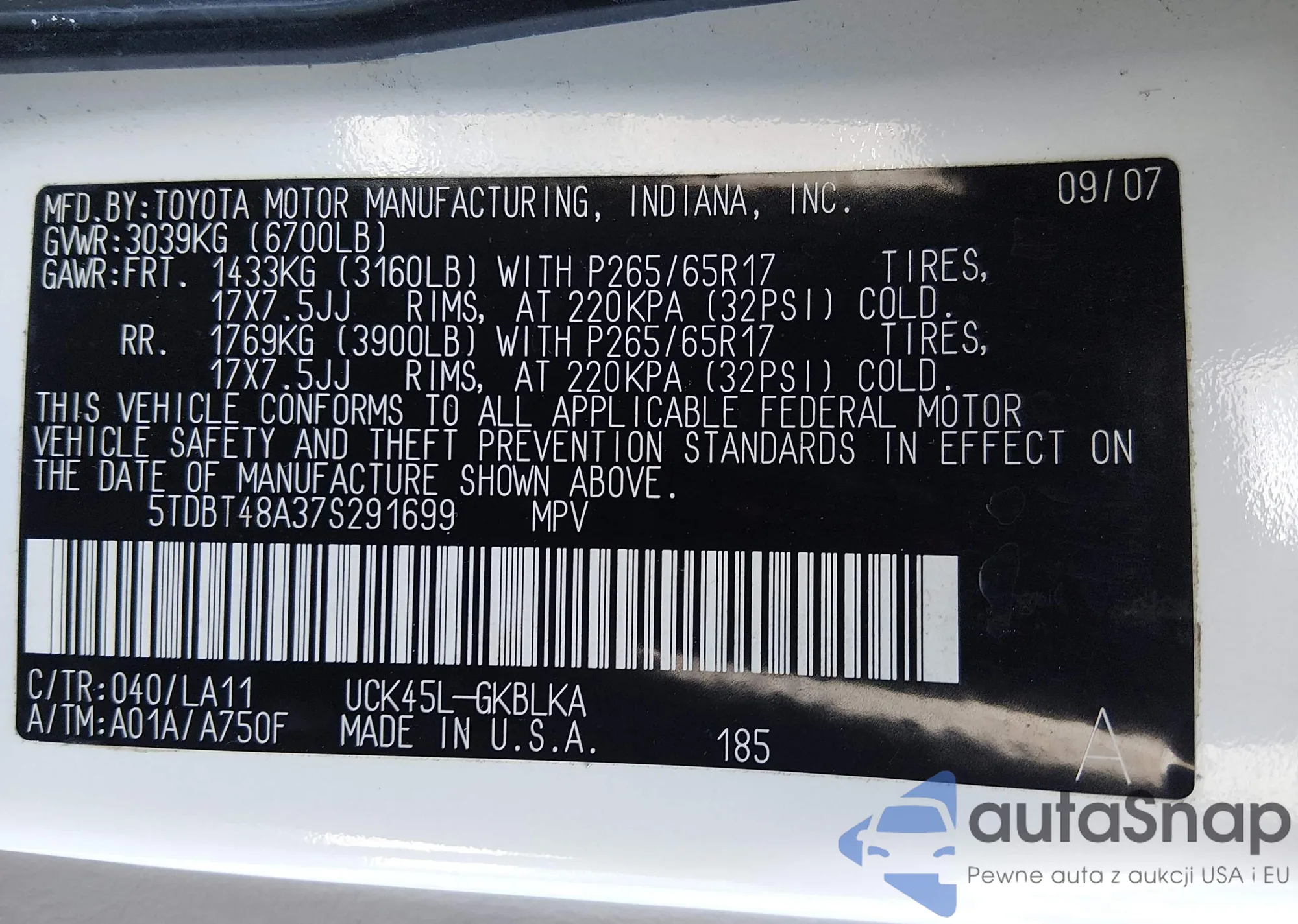 • VIN: 5TDBT48A37S291699